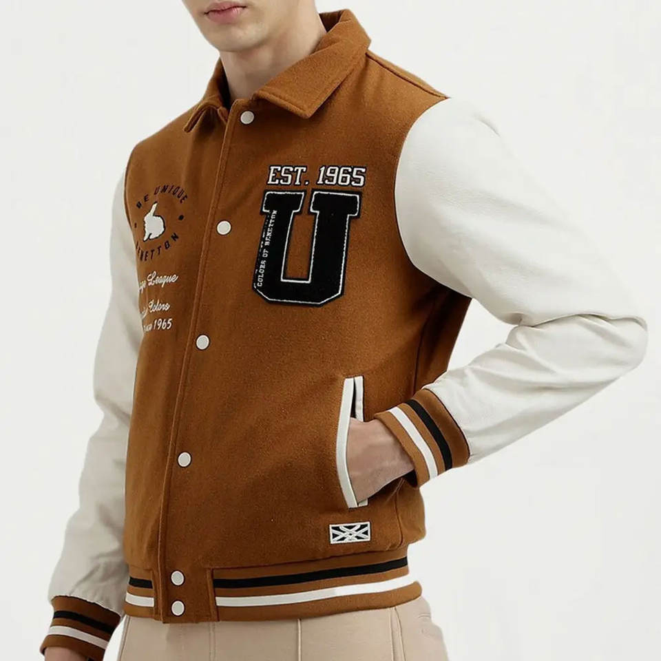 Men's varsity jacket custom logo leather sleeves different mix solid colors customization designs jackets