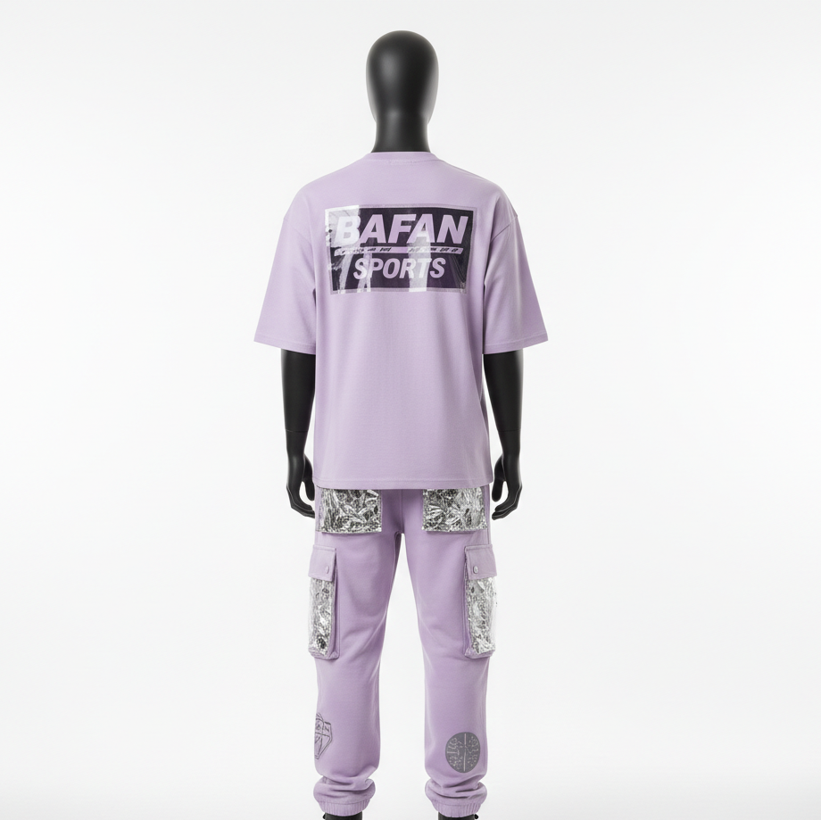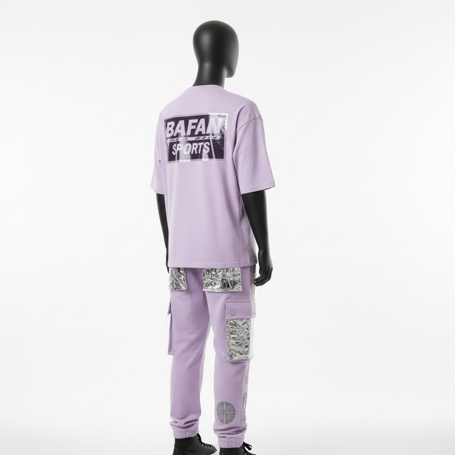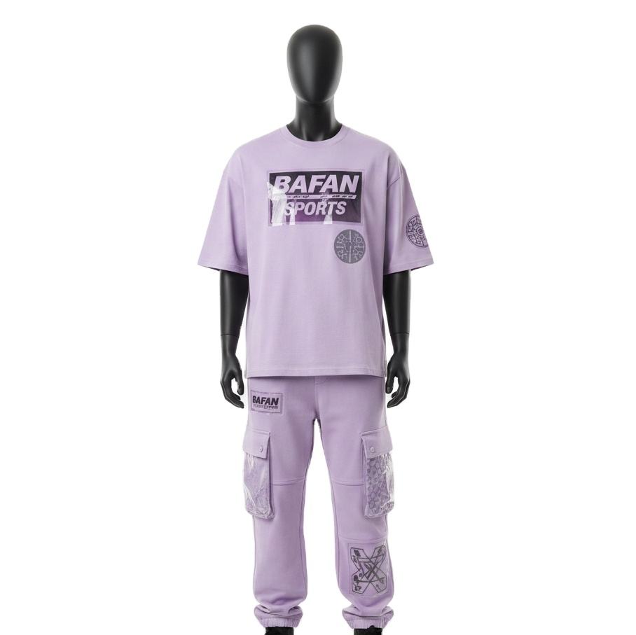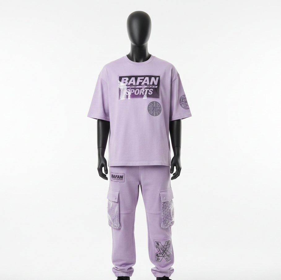 เสื้อยืดผ้าคอตตอนผสมเนื้อหนัก 300 GSM สำหรับผู้ชาย และกางเกงคาร์โก้ ชุดเซ็ต 2 ชิ้น ลายกราฟิกสีม่วงลาเวนเดอร์ สตรีทแวร์แบบสั่งทำพิเศษสำหรับผู้ชาย