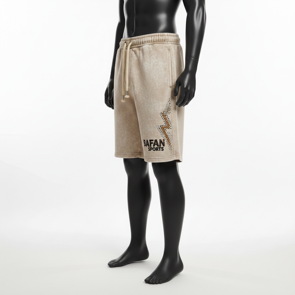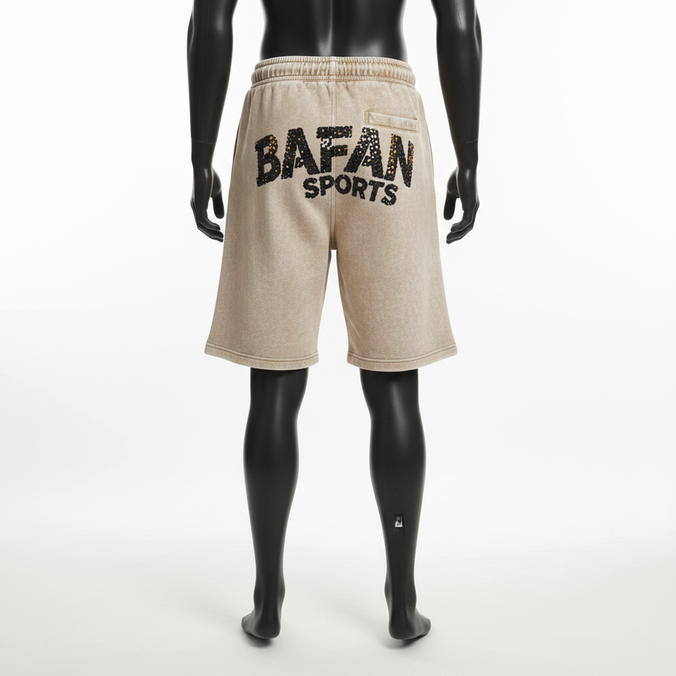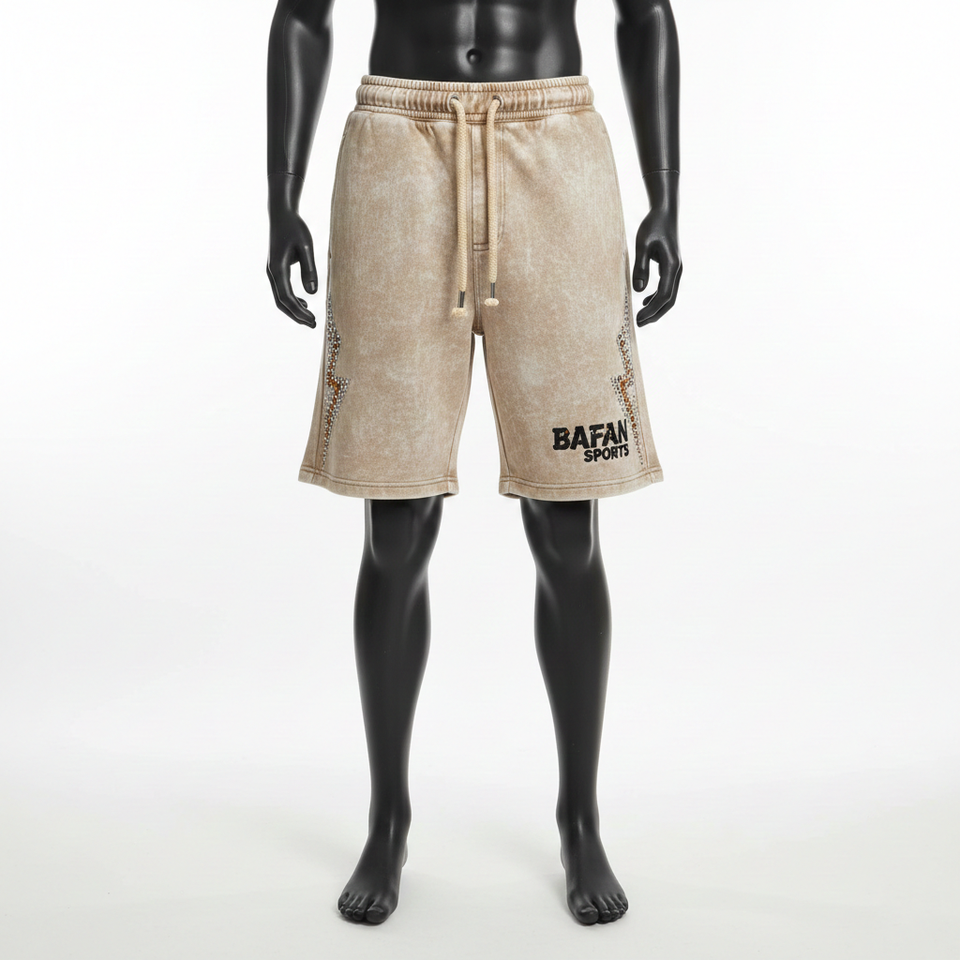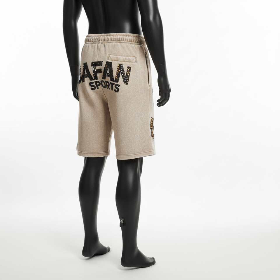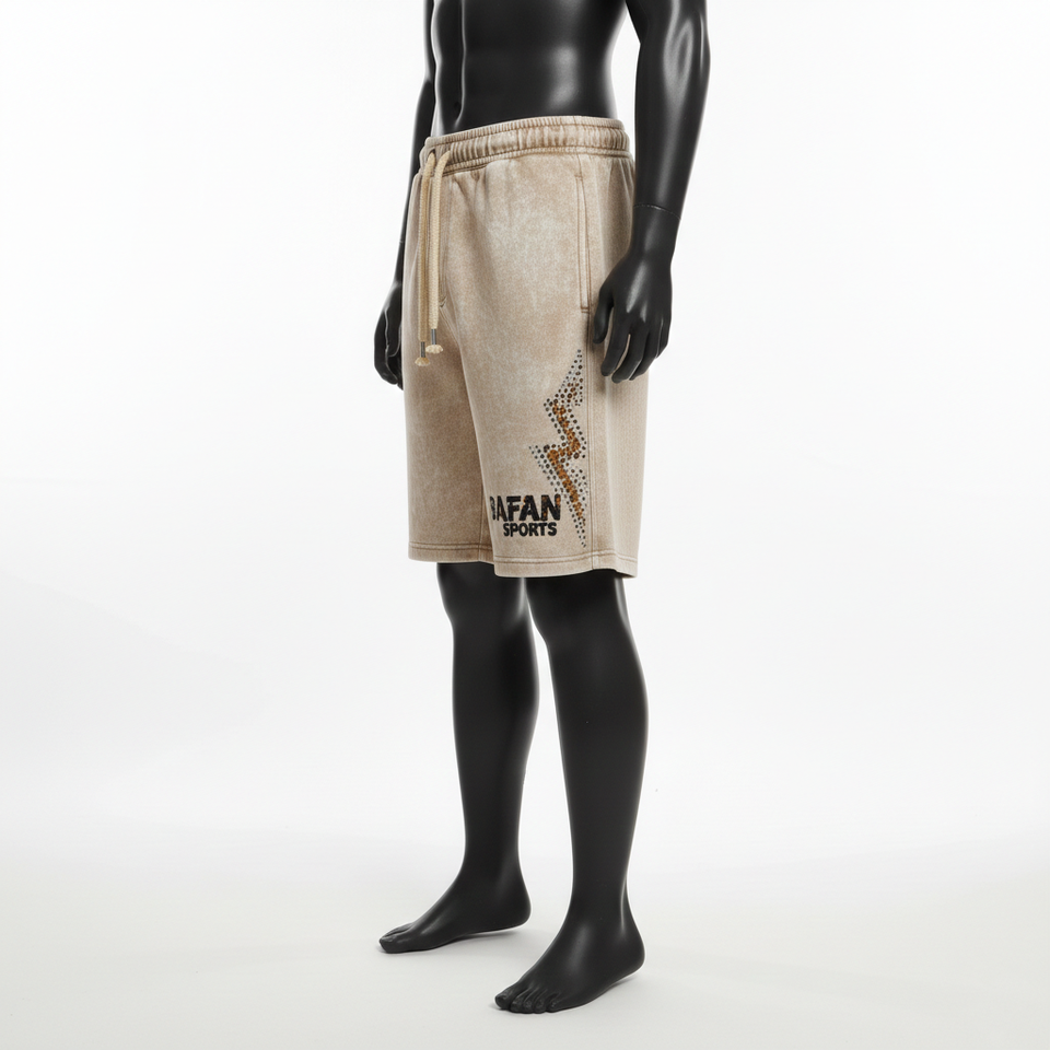 กางเกงขาสั้นผู้ชายแบบย้อมสีเอซิด 300 GSM ผ้าฝ้ายผสมโพลีเอสเตอร์ ขนแกะสีเบจ แต่งแถบข้างประดับเพชร ปักโลโก้ตามสั่ง