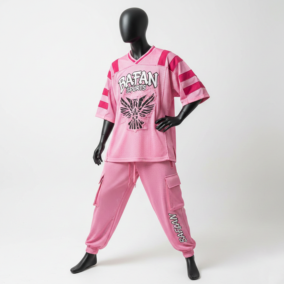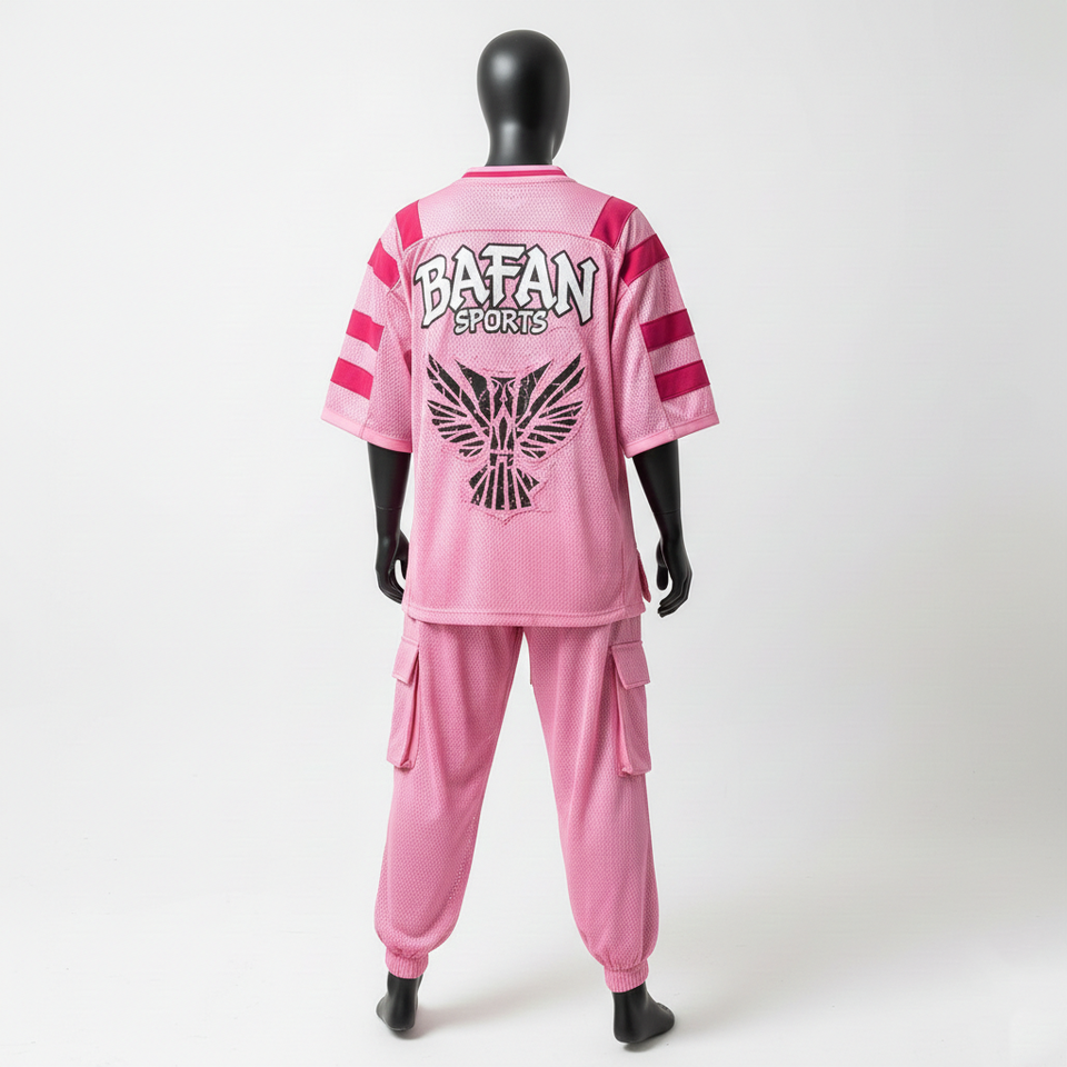 ชุดกางเกงเจอร์ซีย์ตาข่ายสำหรับผู้ชาย 180 GSM ผ้าโพลีเอสเตอร์น้ำหนักเบา สีชมพูลายทาง พิมพ์ลายสกรีนโลโก้ตามสั่ง ชุด 2 ชิ้น สำหรับผู้ชาย