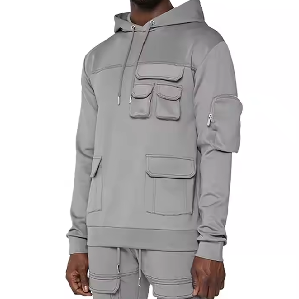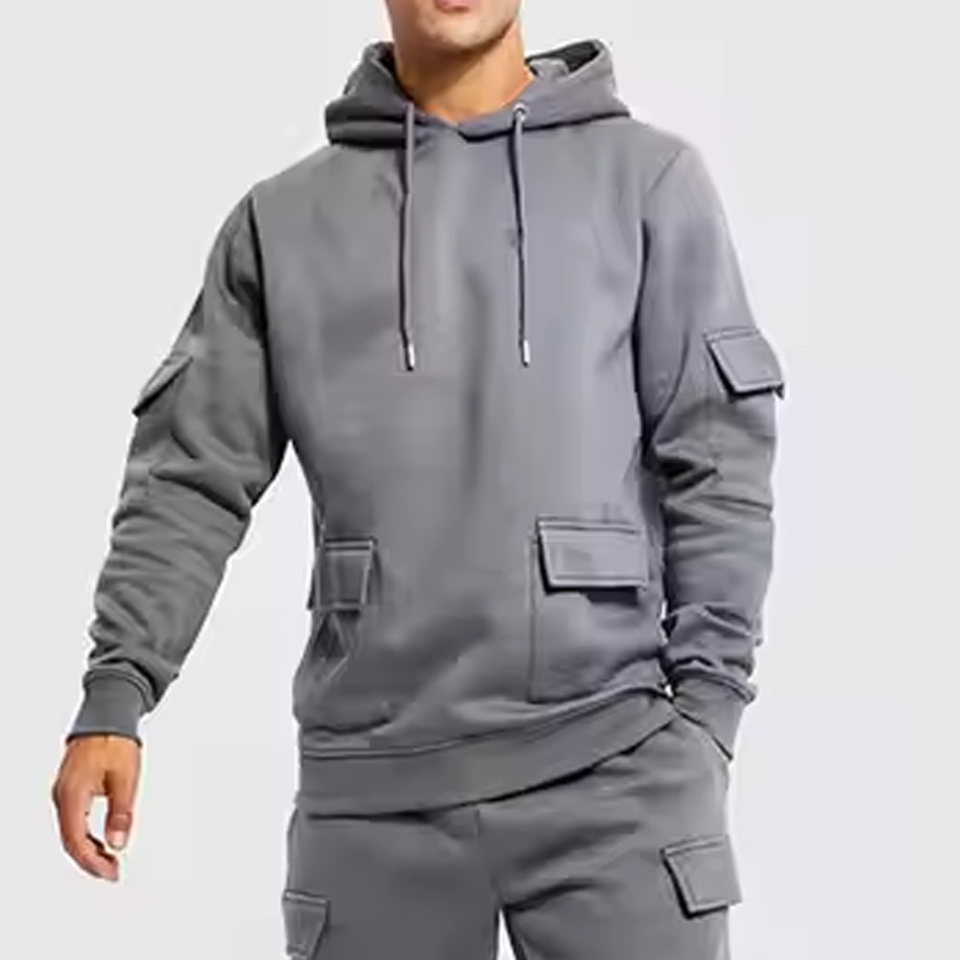 เสื้อฮู้ดคาร์โก้สีพื้นลำลองสำหรับผู้ชายแฟชั่นสตรีทแวร์มีหลายกระเป๋าซิป ผ้าฝ้ายออร์แกนิค 100%