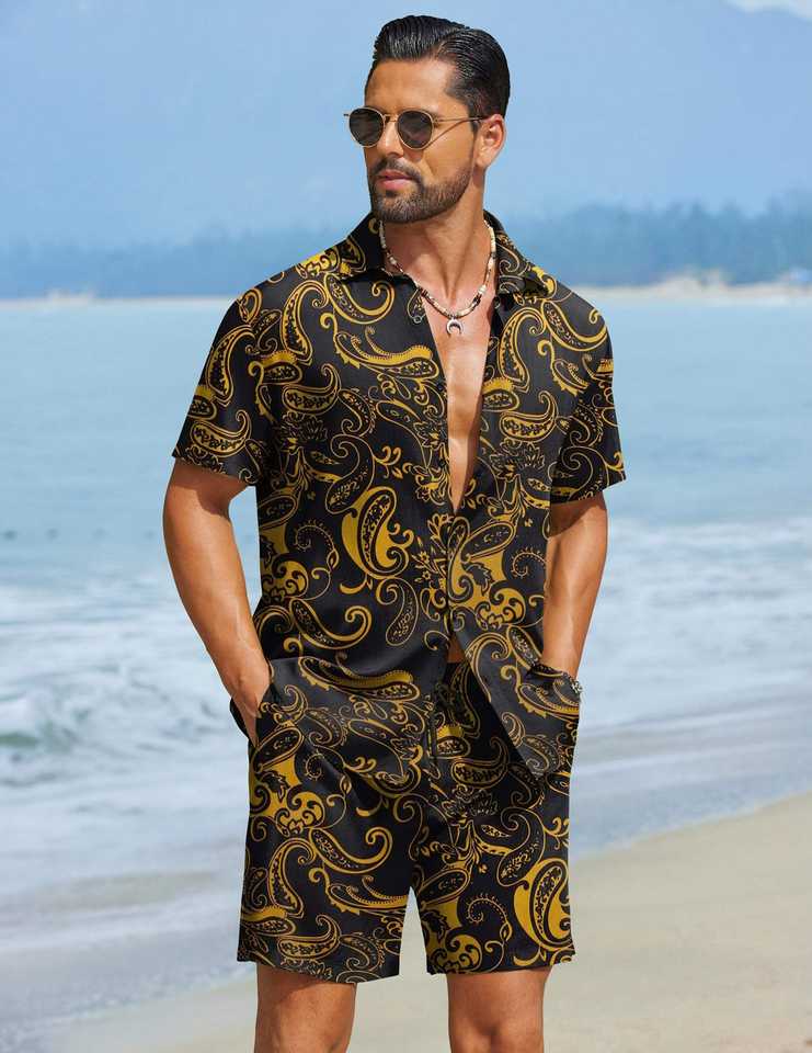 ชุดเซ็ตบาร็อคเพสลีย์สำหรับผู้ชาย เสื้อเชิ้ตแขนสั้นติดกระดุมและกางเกงขาสั้นเข้าชุด ชุดลำลองฤดูร้อน น้ำหนักเบา ระบายอากาศได้ดี
