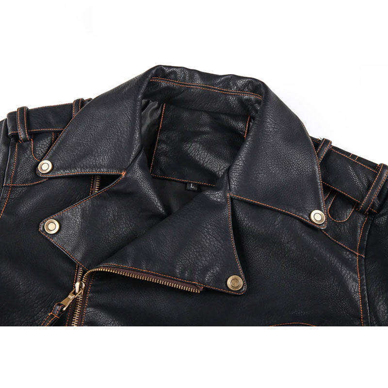 เสื้อแจ็คเก็ตหนังเทียมสีดำสำหรับผู้ชาย สไตล์นักขี่มอเตอร์ไซค์ แบบซิป ทรงเข้ารูป สตรีทแวร์ แจ็คเก็ตหนัง PU