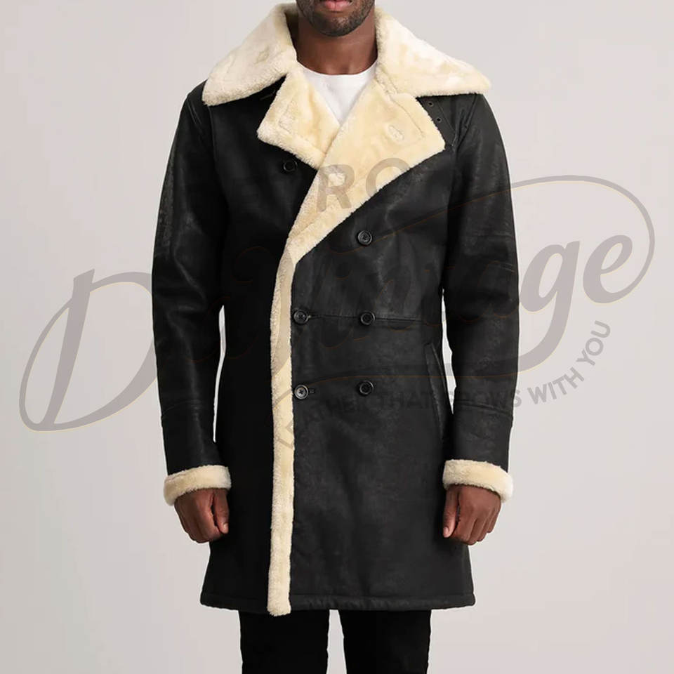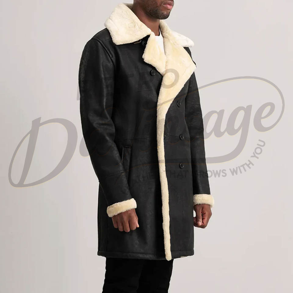 เสื้อโค้ทหนังแท้สีดำสำหรับผู้ชาย แบบยาว บุขนแกะ อุ่นสบายสำหรับฤดูหนาว พร้อมปกขนสัตว์