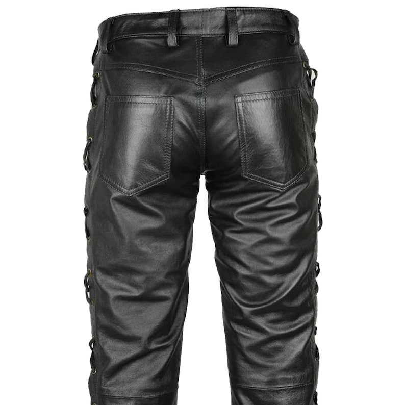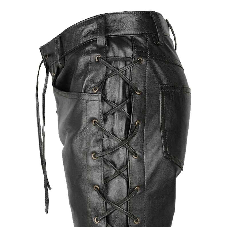 กางเกงหนังผูกเชือกสีดำสำหรับผู้ชายกางเกงไบเกอร์ปรับได้กางเกงไบเกอร์กางเกงหนังสไตล์ร็อค-สลิมฟิตกางเกงไบเกอร์ทำด้วยมือ