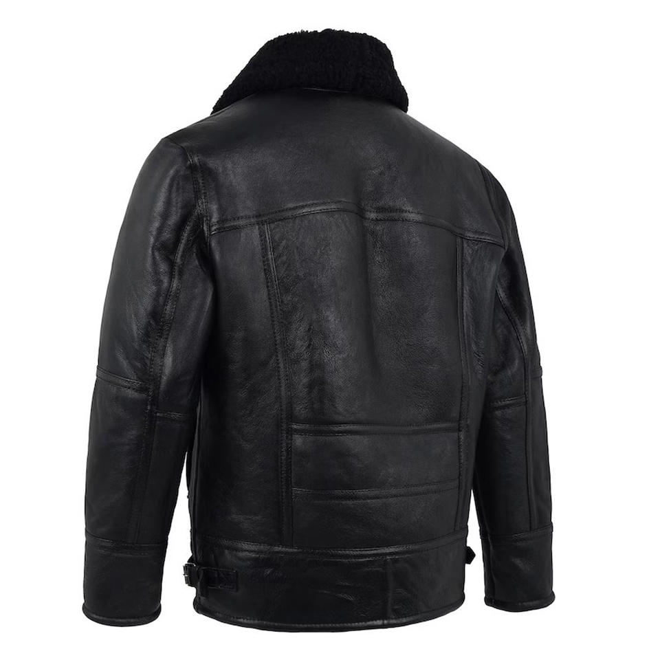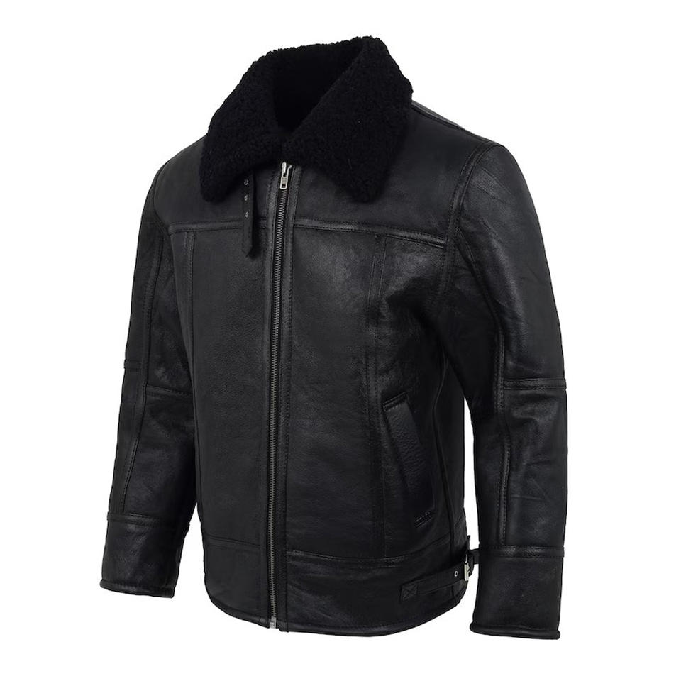 เสื้อแจ็คเก็ตหนังสีดำสำหรับผู้ชาย พร้อมปกขนสัตว์สีดำ เสื้อโค้ทบีทรี วินเทอร์ ชีร์ลิง บี3 หนังแกะแท้ บุขนแกะอุ่นๆ สไตล์ไบค์เกอร์