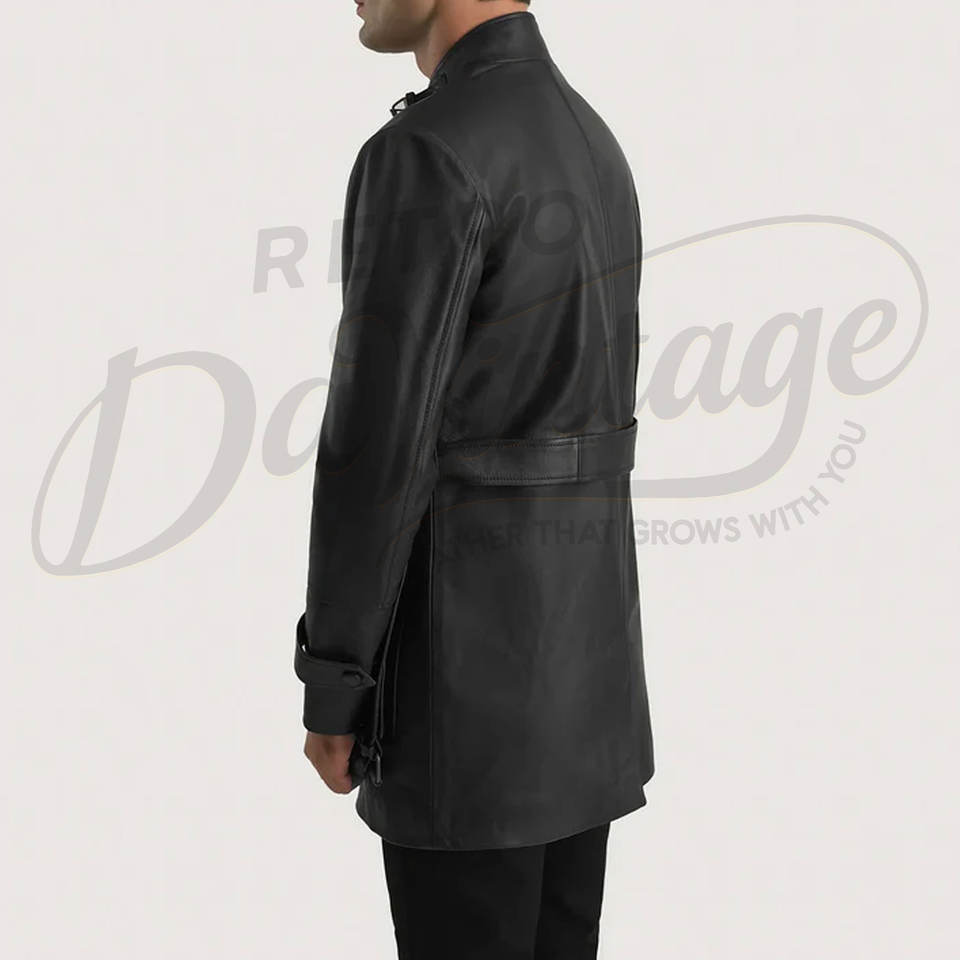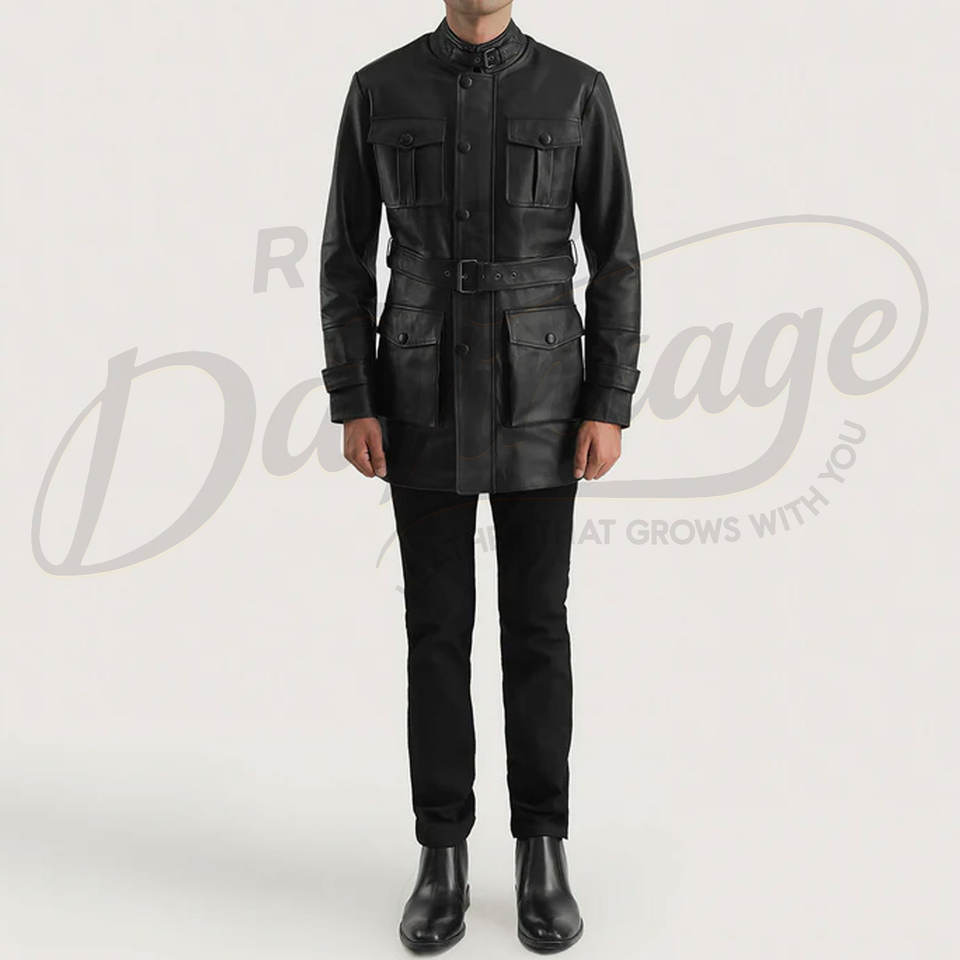 เสื้อแจ็คเก็ตหนังแท้สีดำสำหรับผู้ชาย ทรงสลิมฟิต มีกระเป๋าหลายช่อง สไตล์ซาฟารี พร้อมเข็มขัด คอตั้ง เสื้อคลุมอเนกประสงค์