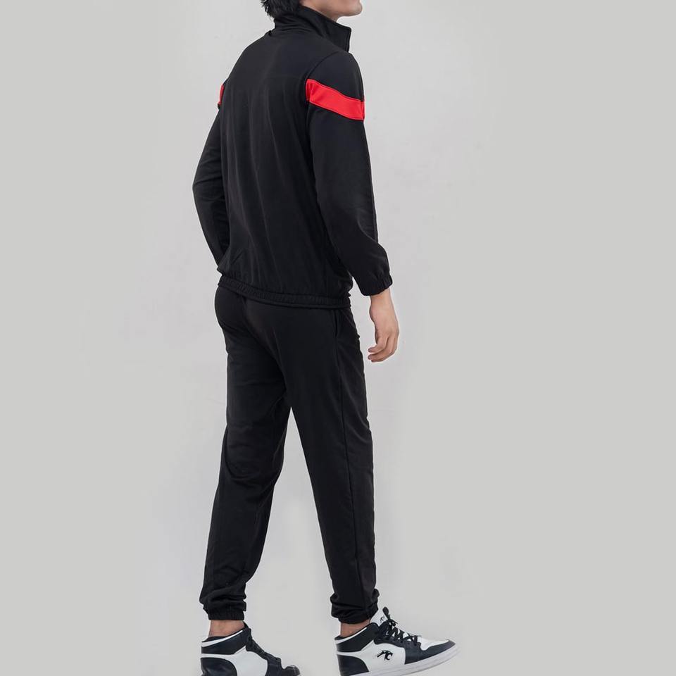 ชุดวอร์มผู้ชายสีดำแบบมีซิปเต็มตัว คอตั้ง แต่งแถบสีแดงที่อก เหมาะสำหรับวิ่ง ออกกำลังกาย ฝึกซ้อม ผลิตจากผ้าโพลี