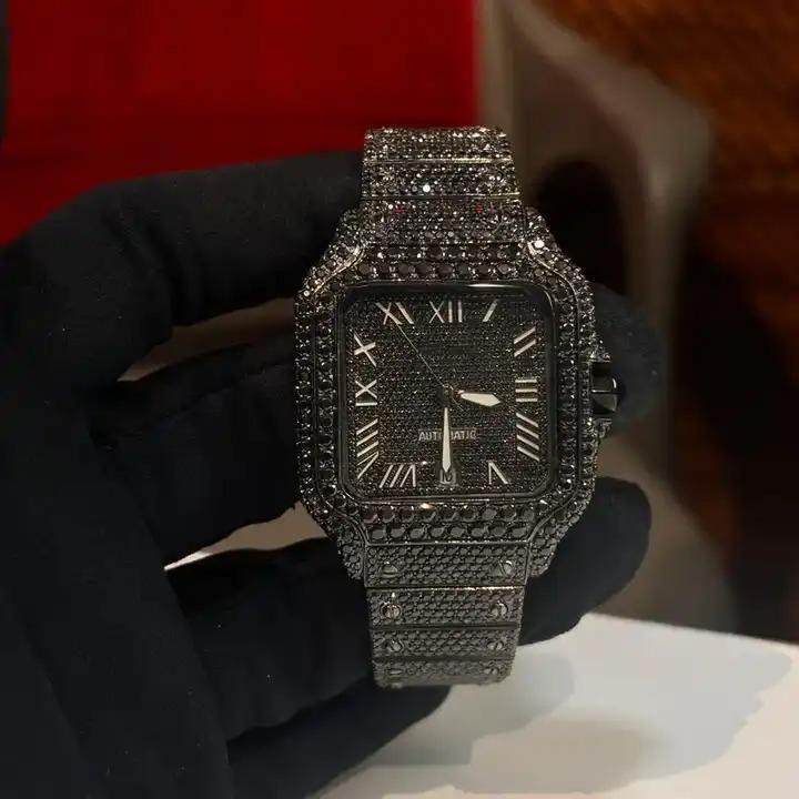 นาฬิกาผู้ชายสีดำประดับเพชรโมอิสซาไนต์ VVS ระดับพรีเมียม ตัวเรือนสแตนเลสสตีลเงางาม หน้าปัดสีสันสวยงาม หรูหรา ผ่านการทดสอบด้วยเครื่องตรวจสอบเพชร