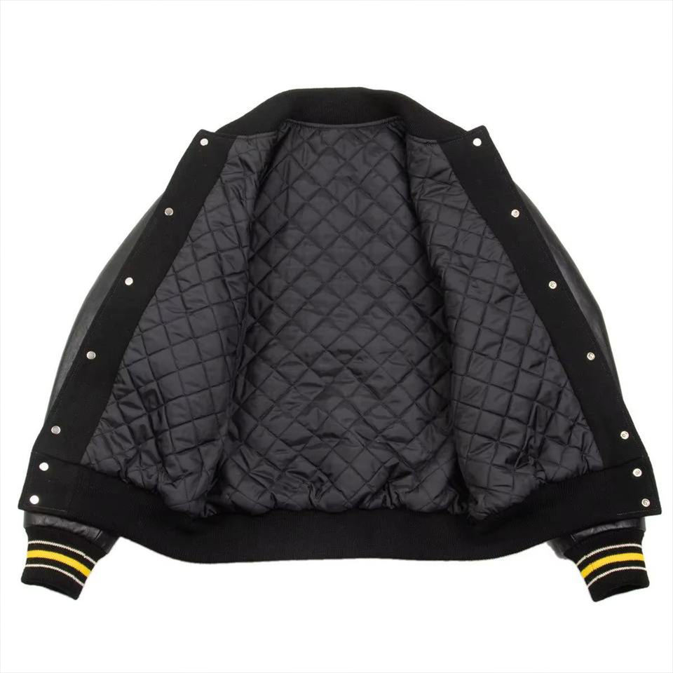 เสื้อแจ็คเก็ตสไตล์วาร์ซิตี้สีดำสำหรับผู้ชาย แขนเสื้อหนัง แต่งซับในแบบควิลท์ แถบสีเหลือง ขอบยางยืด แฟชั่นสตรีทแวร์แนวอเมริกัน