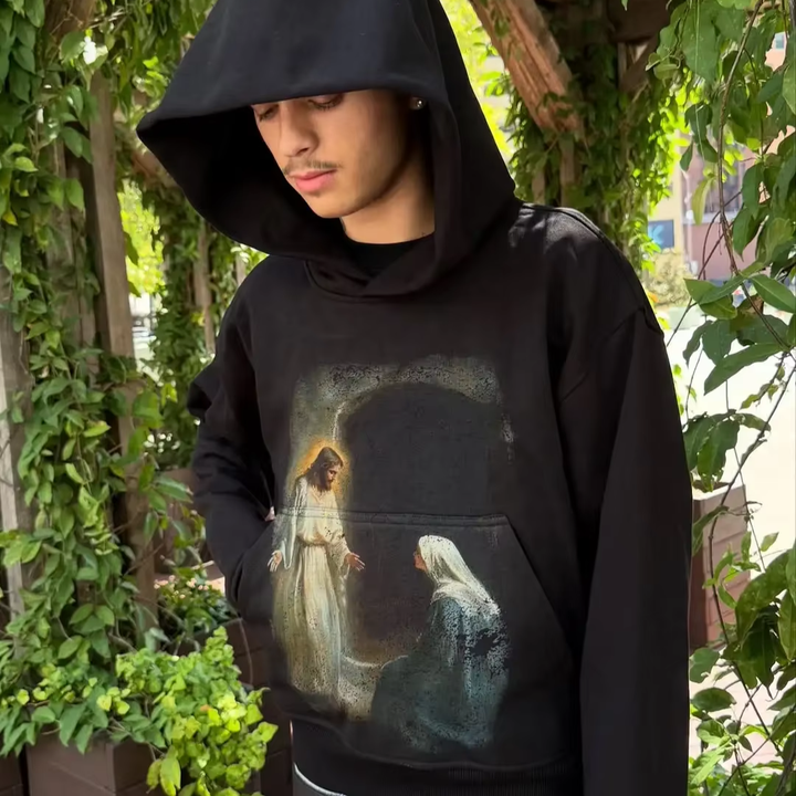 เสื้อฮู้ดผู้ชายสีดำผ้าฟลีซสำหรับฤดูหนาว สไตล์สตรีทแนวศาสนา ทันสมัย เหมาะกับคนเมือง วัยรุ่น เท่ห์ มีสไตล์
