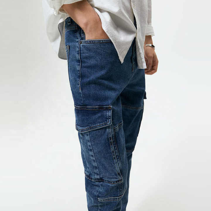 กางเกงยีนส์เดนิมสีน้ำเงินทรงสลิมฟิตสำหรับผู้ชาย ผ้าฝ้าย มีกระเป๋าหลายช่อง เหมาะสำหรับใส่ทำงานลำลอง คุณภาพสูง แฟชั่นสำหรับผู้ชาย ขายส่ง