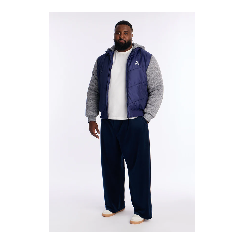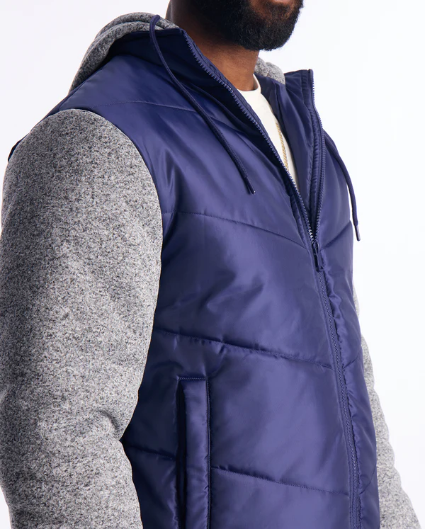 เสื้อแจ็คเก็ตแบบเสื้อกั๊กบุนวมสีน้ำเงินสำหรับผู้ชาย แขนเสื้อผ้าฟลีซสีเทา แจ็คเก็ตลำลองสำหรับฤดูหนาว ผลิตโดย Antique Fashion