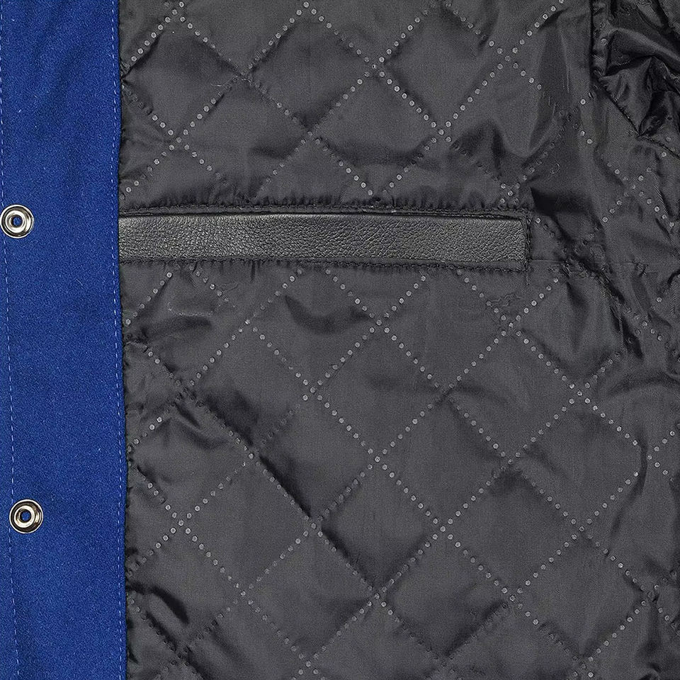 เสื้อแจ็คเก็ตวาร์ซิตี้สีน้ำเงินสำหรับผู้ชาย แขนเสื้อสีแดง สไตล์เบสบอลแบบคลาสสิก