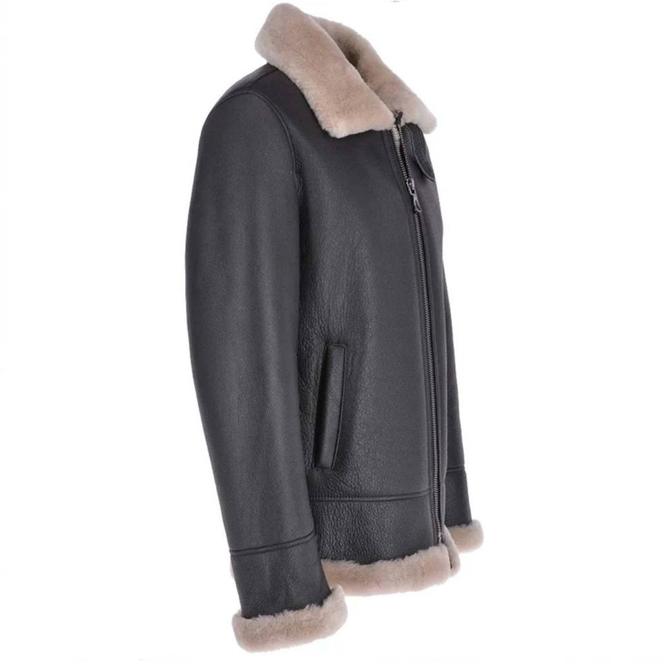 เสื้อแจ็คเก็ตหนังสีเทาชาร์โคลสำหรับผู้ชาย ปกขนสีเบจ เสื้อโค้ทขนแกะสำหรับฤดูหนาว หนังแกะแท้ บุขนแกะอุ่น เสื้อแจ็คเก็ตนักบิน