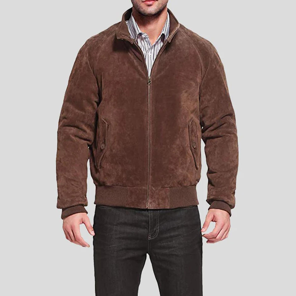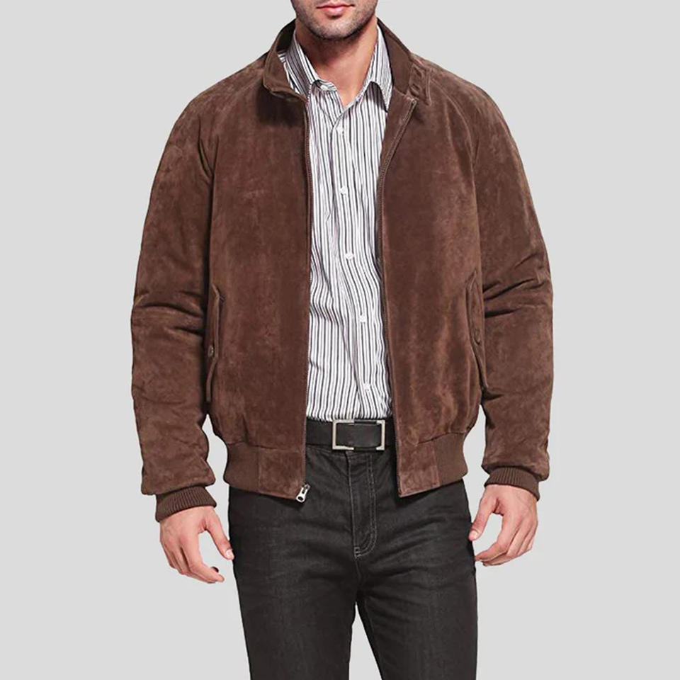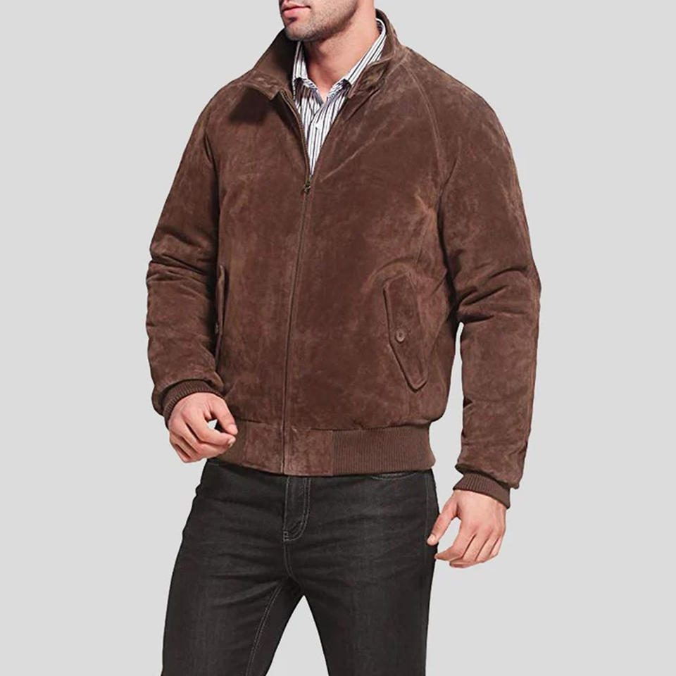 Mens Chocolate Brown Suede Jacket Harrington Style Bomber Coat Real Goat Suede Leather Slim Fit Soft Casual Outerwear