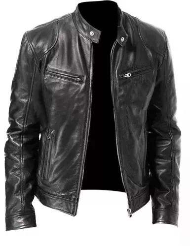 แจ็กเก็ตหนัง Moto สีดำสำหรับผู้ชายแจ็คเก็ตมอเตอร์ไซด์แบบลำลองแขนยาวมีซิปด้านหน้าสีทึบ