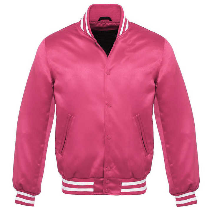 เสื้อแจ็คเก็ตบอมเบอร์แบบคลาสสิกสำหรับผู้ชาย ผ้าซาติน สีชมพู เหลือง แดง คอลเลคชั่นลายทาง แต่งขอบยางยืด กระดุมแป๊ก สไตล์สปอร์ต แบบ Letterman สำหรับเล่นเบสบอล