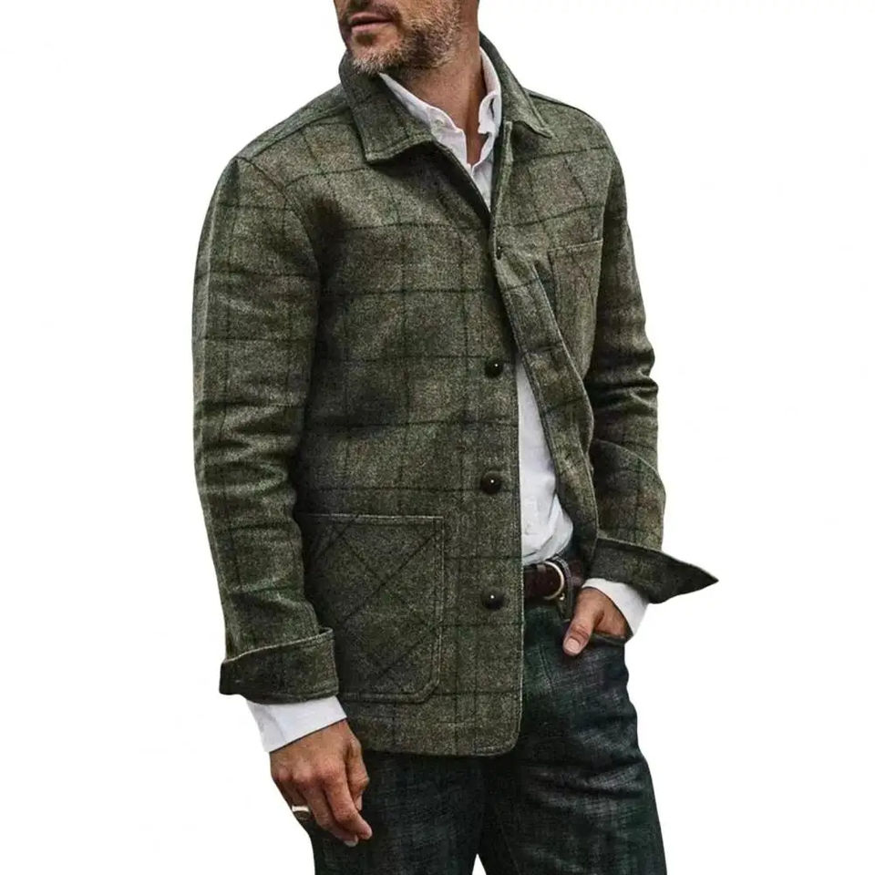 เสื้อโค้ทผ้าสักหลาดลายสก็อตสำหรับผู้ชายแจ็กเก็ตแฟชั่นโอเวอร์ไซส์ลำลองแนววินเทจ