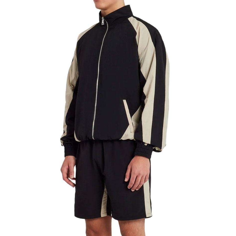 ชุดแจ็คเก็ตวินด์เบรกเกอร์และกางเกงขาสั้นผู้ชายแบบสองสี ชุดกีฬาน้ำหนักเบาสองชิ้น สำหรับวิ่ง ออกกำลังกาย สไตล์สตรีทแวร์