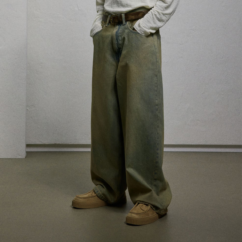 กางเกงยีนส์ทรงหลวมระบายอากาศได้ดีมีสีระบายได้ดีสำหรับผู้ชายกางเกงยีนส์ขาใหญ่พิเศษใส่สบายสไตล์สตรีท