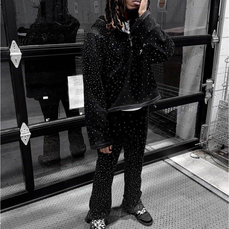ชุดวอร์มมีซิปสำหรับผู้ชายชุดวอร์มล้างแบบกรดกางเกงวอร์มและกางเกงวอร์มและพลอยเทียมสำเนียงสตรีทแวร์สินค้าจำเป็นสำหรับผู้ชาย