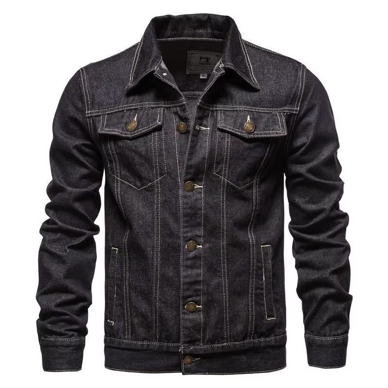 แจ็คเก็ตยีนส์สีน้ำเงินเข้มสำหรับผู้ชาย ทรงคลาสสิก กระดุมสีบรอนซ์ กระเป๋าแบบมีฝาปิดที่อก ดีเทลการเย็บที่ทนทาน