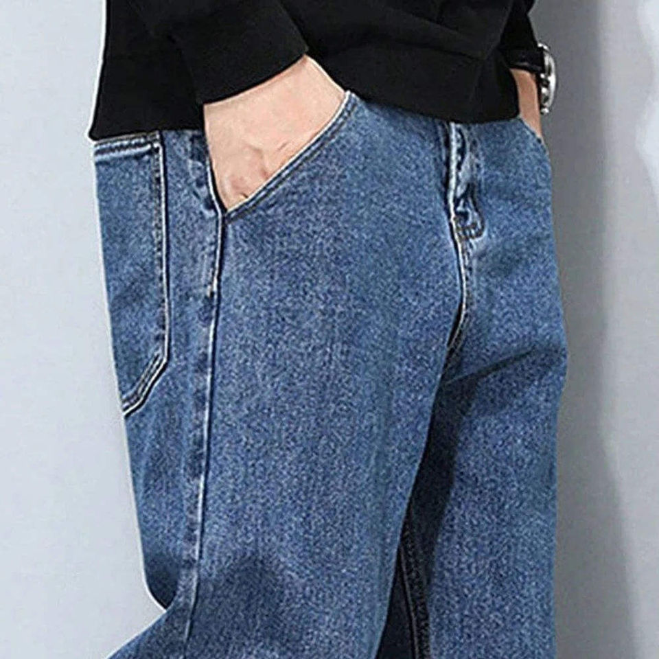 เสื้อแจ็คเก็ตเดนิมสีน้ำเงินเข้มทรงเข้ารูปสำหรับผู้ชาย กางเกงขายาวทรงลำลองขาบานแบบสบายๆ ขอบขาพับได้ ผ้าฝ้ายเนื้อเบา กันน้ำ