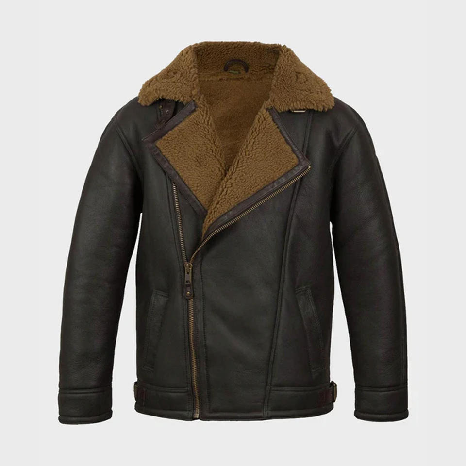 เสื้อแจ็คเก็ตหนังสีน้ำตาลเข้มสำหรับผู้ชาย แต่งปกขนสีแทน เสื้อโค้ทขนแกะสำหรับฤดูหนาว ทำจากหนังแกะแท้บุด้วยขนแกะอุ่นๆ