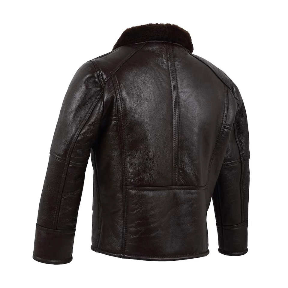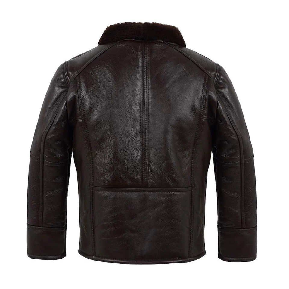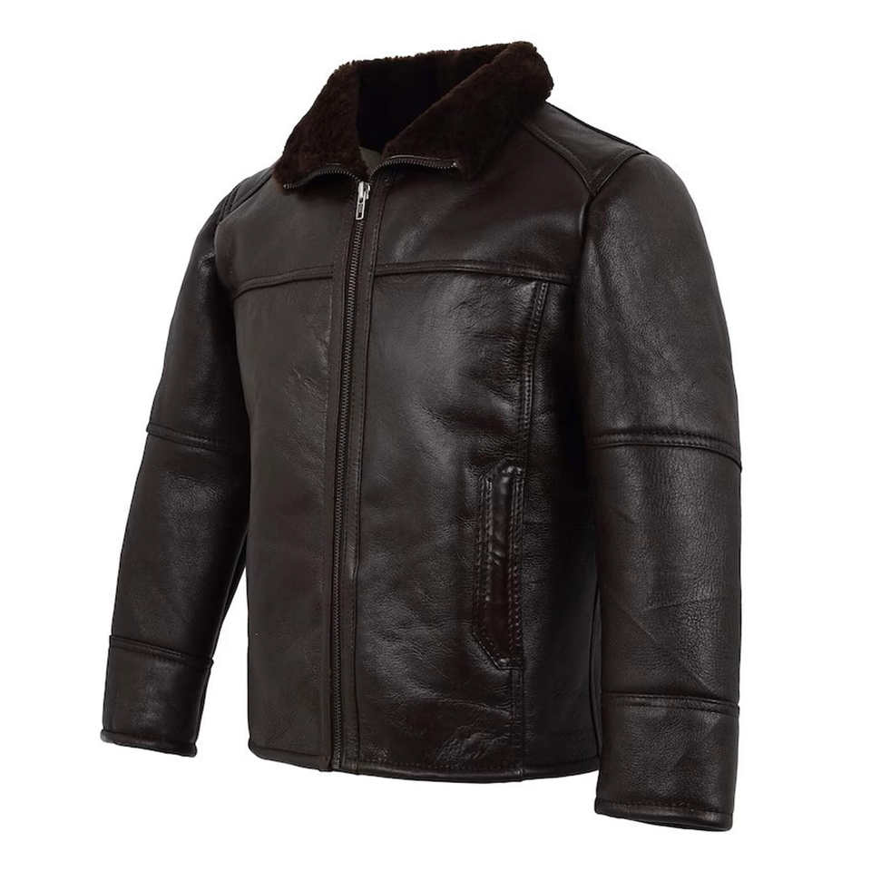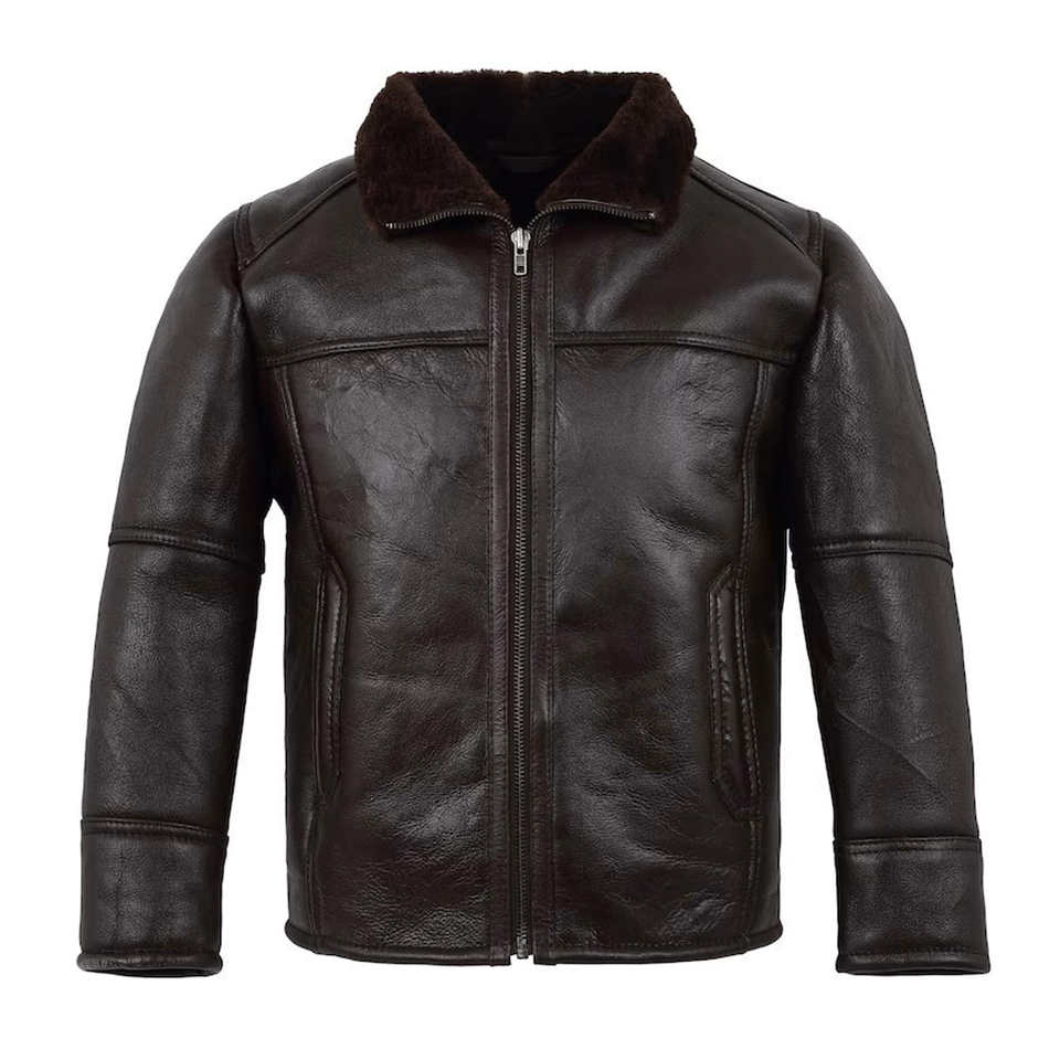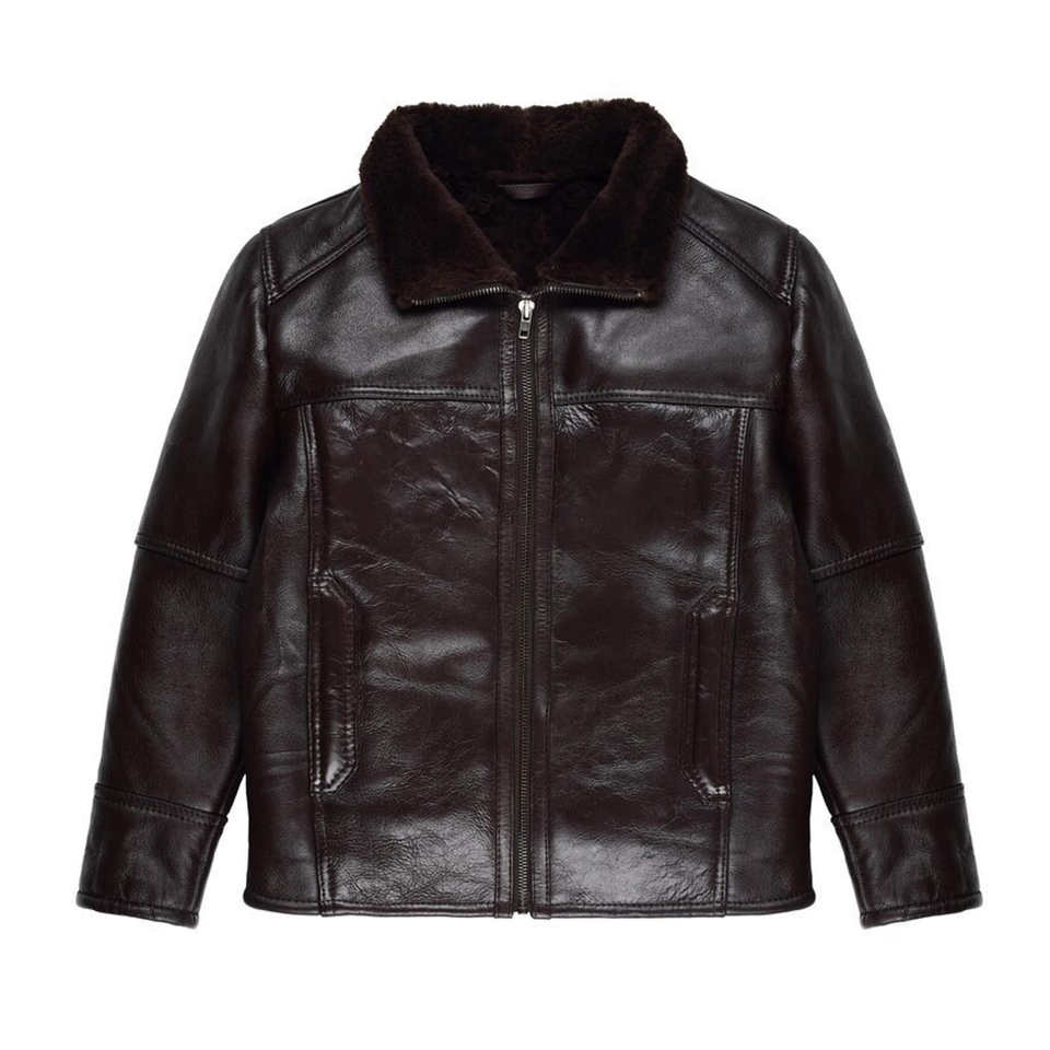 เสื้อแจ็คเก็ตหนังสีน้ำตาลเข้มสำหรับผู้ชาย พร้อมปกขนสัตว์ เสื้อโค้ทขนแกะสำหรับฤดูหนาว หนังแกะแท้ บุขนแกะอุ่นๆ สไตล์ไบค์เกอร์