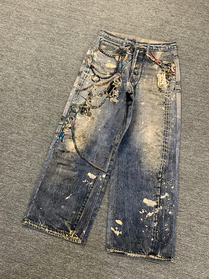 กางเกงยีนส์ทรงหลวมดีไซน์เนอร์สำหรับผู้ชาย สไตล์ Y2K พร้อมลายปัก ปะติดโซ่โลหะ และลายพิมพ์ดิจิทัล