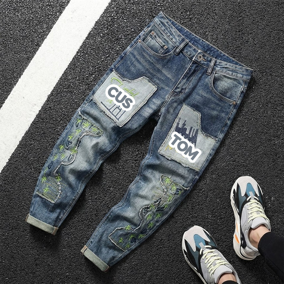 กางเกงยีนส์ทรงบอยเฟรนด์ผู้ชายแบบดิสเทรสพิมพ์ลาย กางเกงสั่งทำรุ่นใหม่ล่าสุด สไตล์ไฮสตรีท ระบายอากาศได้ดี กางเกงสกินนี่ กางเกงสเวตแพนท์ปักลายตามสั่ง