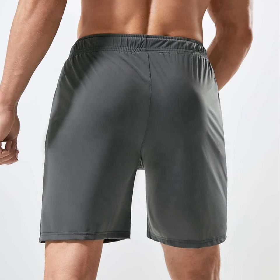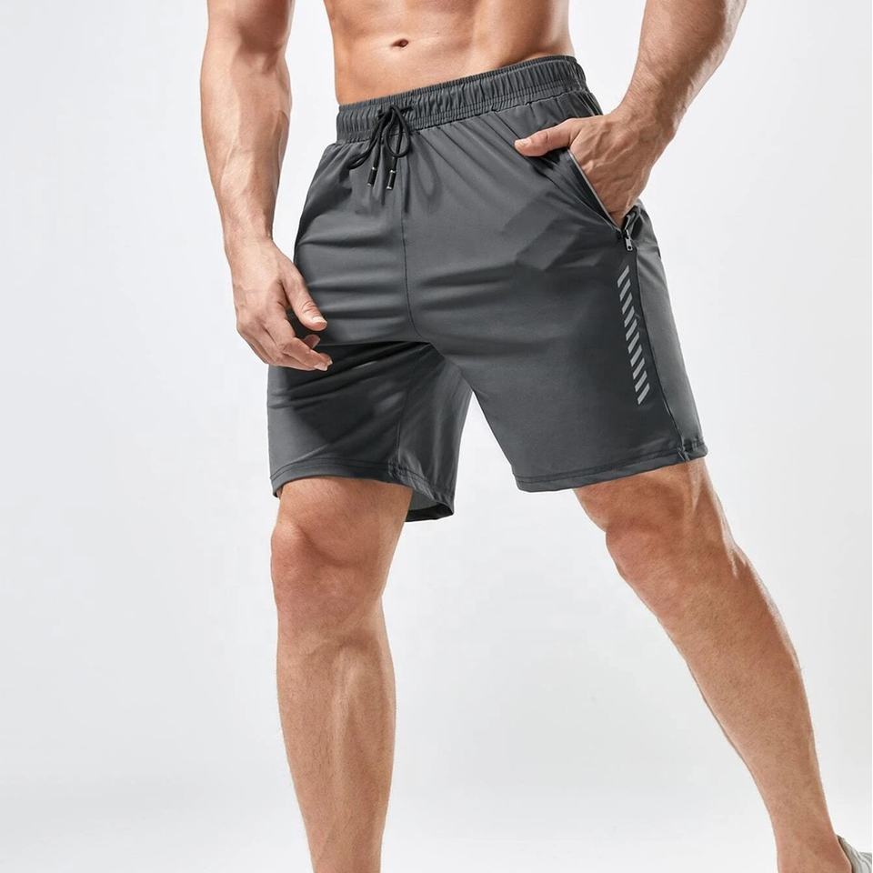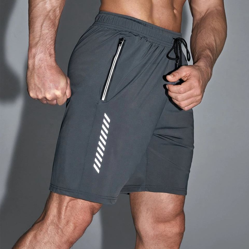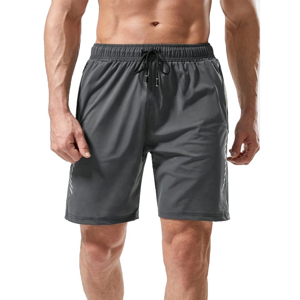 กางเกงขาสั้นกีฬาขาสั้นสำหรับผู้ชาย,มีกระเป๋ามีซิปสีพื้นเอวยางยืดสำหรับผู้ชายฝึกวิ่งออกกำลังกายเพาะกาย