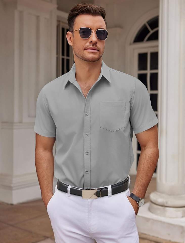 ชุดเดรสสำหรับผู้ชายเสื้อเชิ้ตลำลองธุรกิจแขนสั้นทรงพอดีตัวเสื้อยืดลำลองมีกระดุม