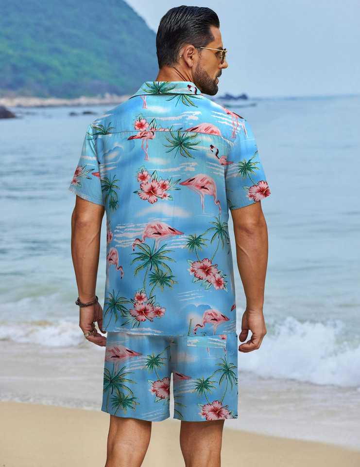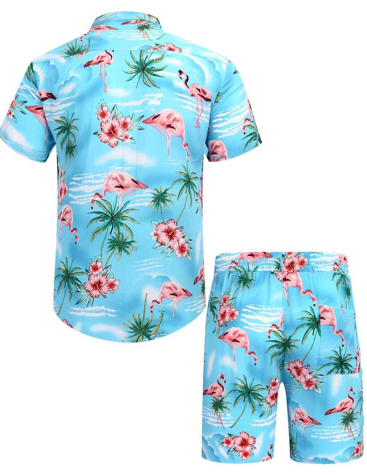 ชุดเซ็ตเสื้อเชิ้ตแขนสั้นลายดอกฟลามิงโกสำหรับผู้ชาย พร้อมกางเกงขาสั้นเข้าชุด ชุดลำลองน้ำหนักเบาสำหรับฤดูร้อนและชายหาด