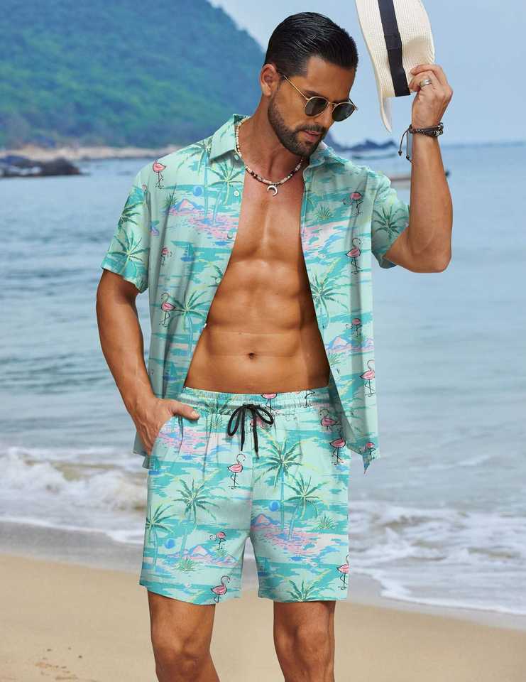 ชุดเซ็ตพิมพ์ลายฟลามิงโกสำหรับผู้ชาย เสื้อเชิ้ตแขนสั้นติดกระดุมและกางเกงขาสั้นเข้าชุด ชุดลำลองน้ำหนักเบาสำหรับวันหยุดพักผ่อนริมชายหาดในฤดูร้อน