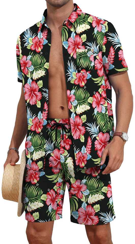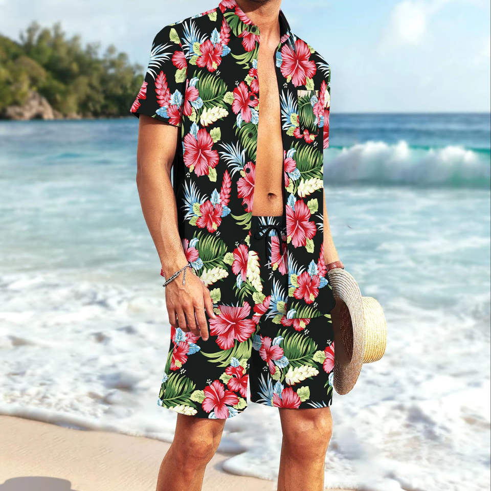 ชุดเซ็ตชายหาดลายดอกไม้สำหรับผู้ชาย เสื้อเชิ้ตแขนสั้นติดกระดุมและกางเกงขาสั้นเข้าชุด ชุดสำหรับวันหยุดฤดูร้อน เนื้อผ้าเบาสบาย ระบายอากาศได้ดี
