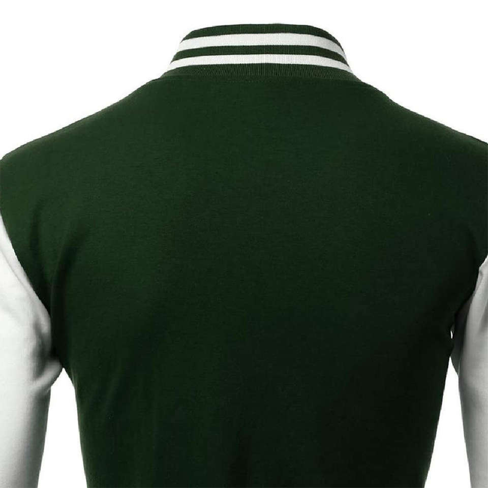 เสื้อแจ็คเก็ตสไตล์วาร์ซิตี้สีเขียวป่าและสีขาวสำหรับผู้ชาย แต่งแถบยางยืด ปิดด้วยกระดุมแป๊ก ทรงเข้ารูป แฟชั่นสตรีทแวร์แนวอเมริกัน
