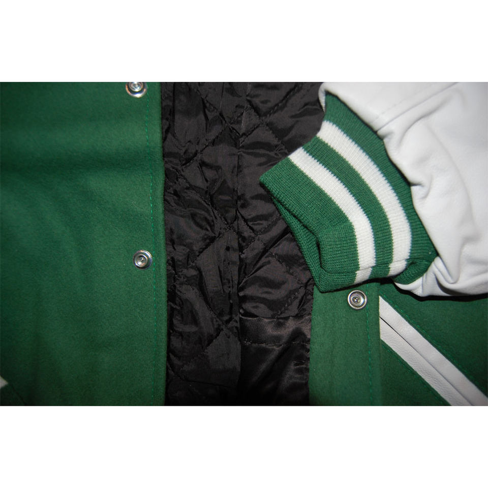 เสื้อแจ็คเก็ตสไตล์วาร์ซิตี้สีเขียวป่าและสีขาวสำหรับผู้ชาย ซับในแบบควิลท์ แต่งขอบลายริบ ปิดด้วยกระดุมแป๊ก แฟชั่นสตรีทแวร์แนวอเมริกัน