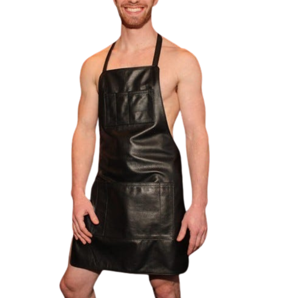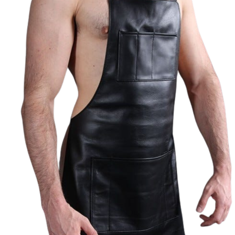 ผ้ากันเปื้อนหนังแท้สำหรับผู้ชาย ดีไซน์เปิดด้านข้าง สายคล้องคอปรับได้ เหมาะสำหรับงานเฟติช BDSM ชุดคลับ สีดำ ทำมือ คุณภาพพรีเมียม รุ่น Pro Max