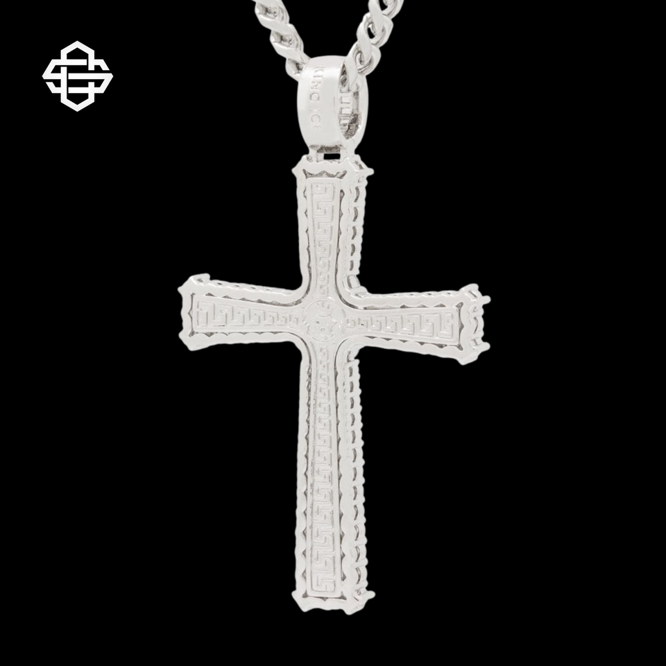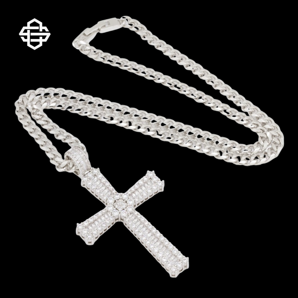 Mens Gold Plated Iced Out Baguette & Round CZ Diamond Cross Pendant Hip Hop Necklace