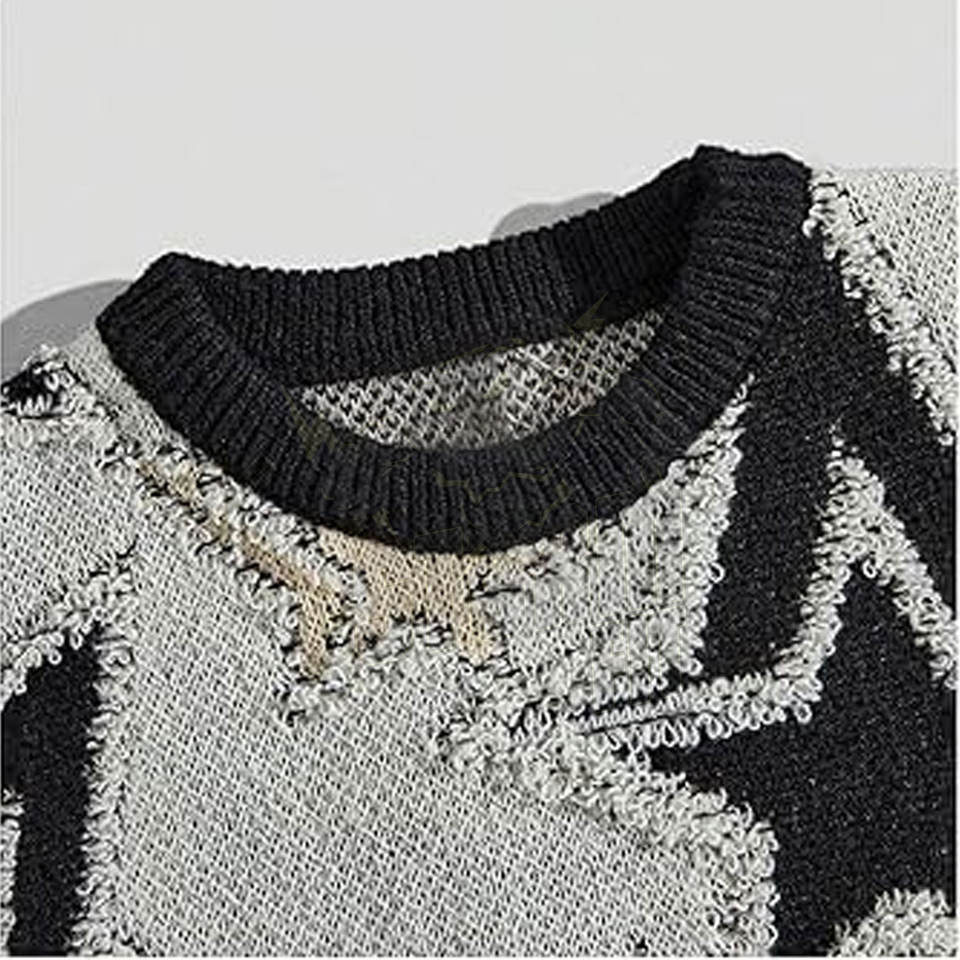 เสื้อสเวตเตอร์ผู้ชายลายกราฟิกสไตล์วินเทจ แขนยาว ทรงหลวม คอวี ไหล่ตก ผ้าถัก สตรีทแวร์ลำลอง