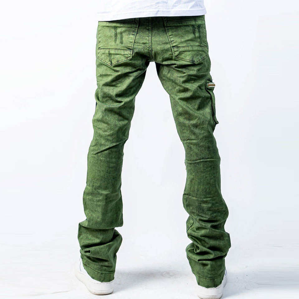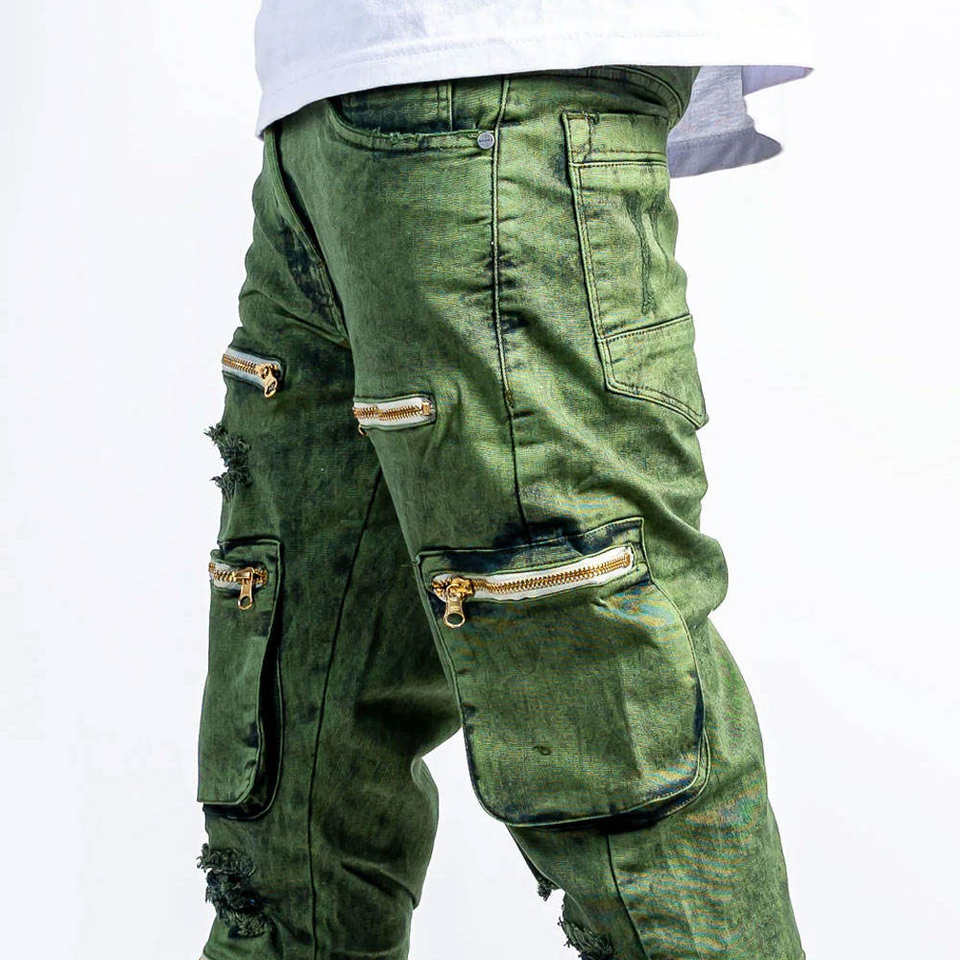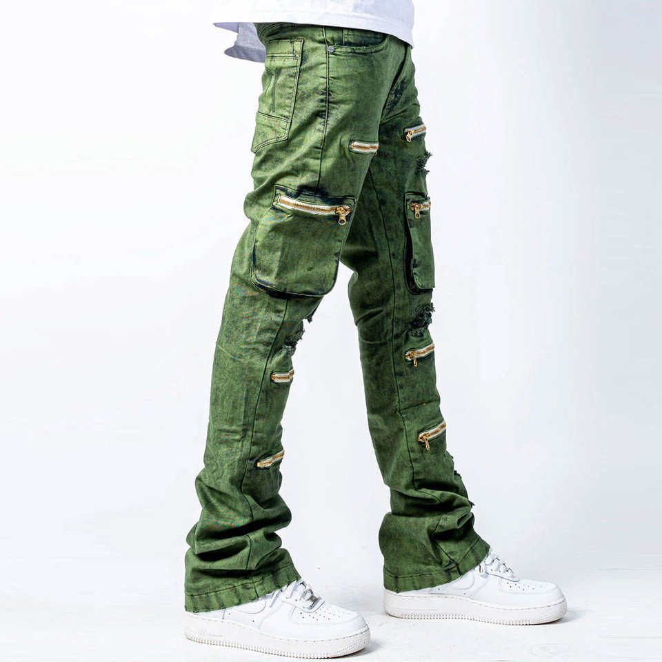 กางเกงยีนส์ผู้ชายสีเขียวทรงสแต็คแฟชั่นสตรีทแวร์ ดีไซน์ซิปหลายจุด ทรงเข้ารูปลำลอง กางเกงเดนิมทันสมัยมีสไตล์ รับผลิตแบบ OEM ODM