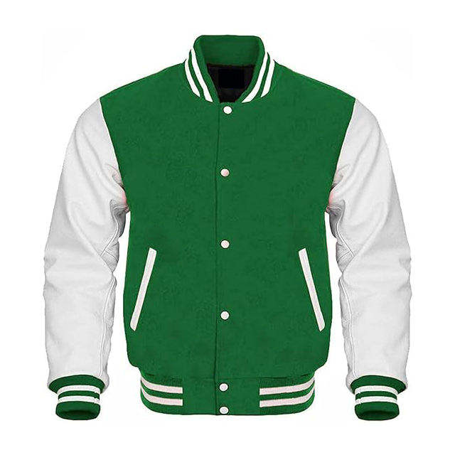 แจ็กเก็ตแฟชั่นสีเขียวสีขาวสำหรับผู้ชายเสื้อนอกบอมเบอร์สไตล์วิทยาลัยทันสมัย