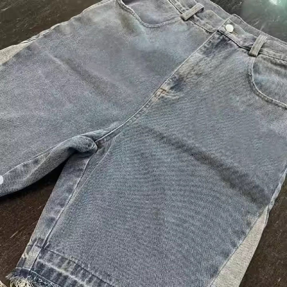 กางเกงยีนส์ขาสั้นผู้ชายสีเทาแต่งพู่ ขอบรุ่ย ทรงหลวม เอวสูง ผลิตจากผ้าฝ้ายกันน้ำ เป็นมิตรกับสิ่งแวดล้อม สไตล์ลำลองสำหรับฤดูร้อน