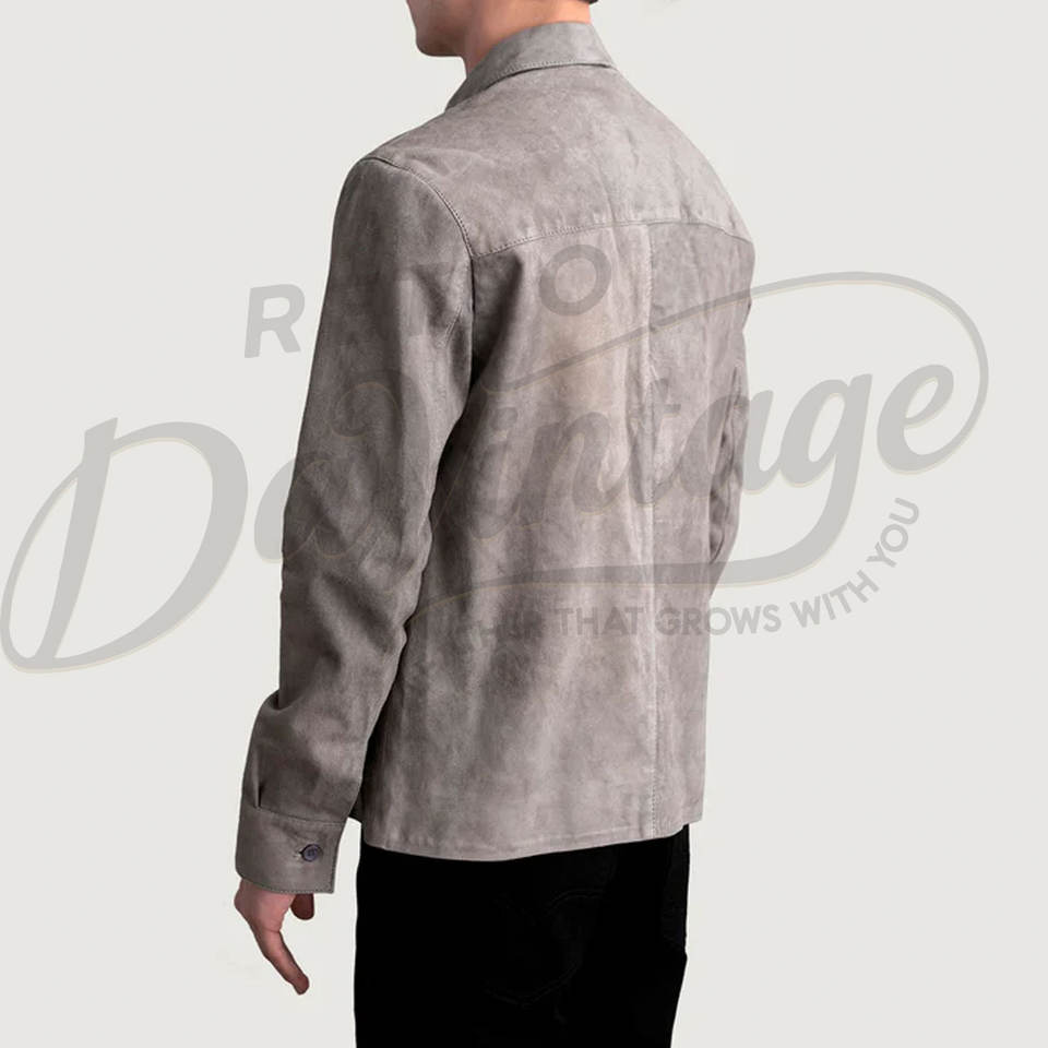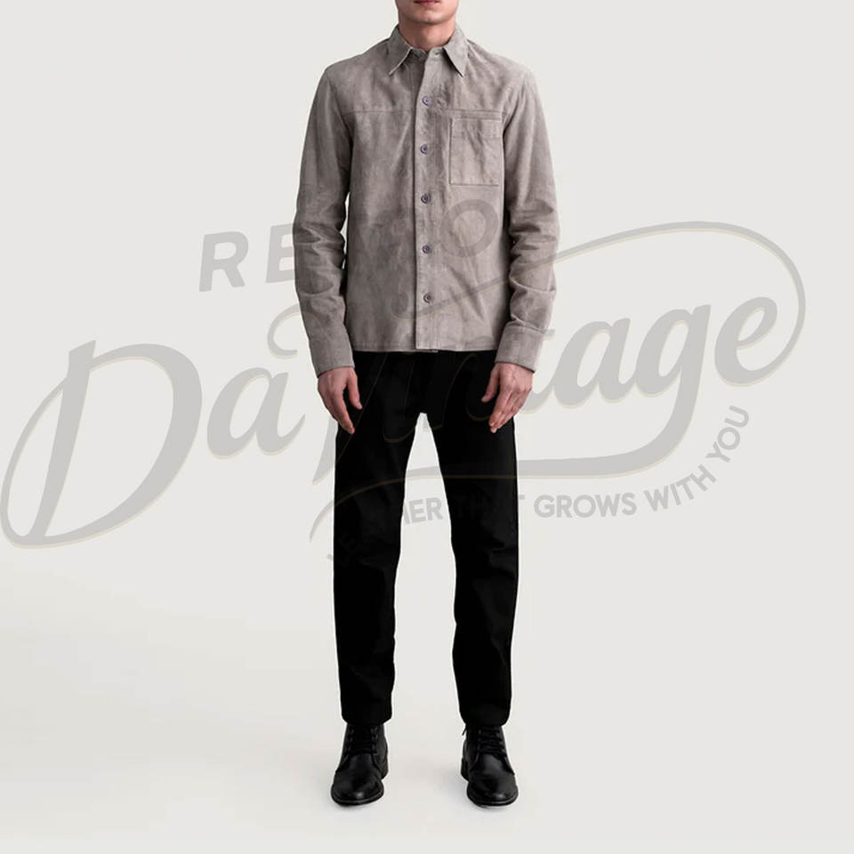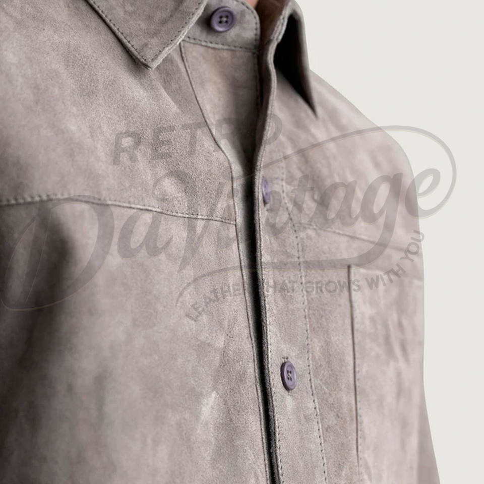 เสื้อแจ็คเก็ตหนังกลับสีเทาสำหรับผู้ชาย หนังแกะแท้ ทรงเข้ารูป สไตล์ลำลอง ติดกระดุม น้ำหนักเบา มีกระเป๋าหน้าอก