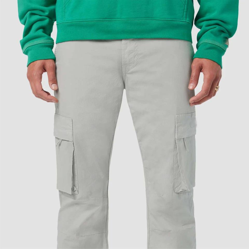 กางเกงขาบานสำหรับผู้ชายสีเทาสำหรับใส่เดินมีรูผ้ายืดสวมใส่สบายพร้อมดีไซน์ขาบานและกระเป๋าใส่ของได้จริง