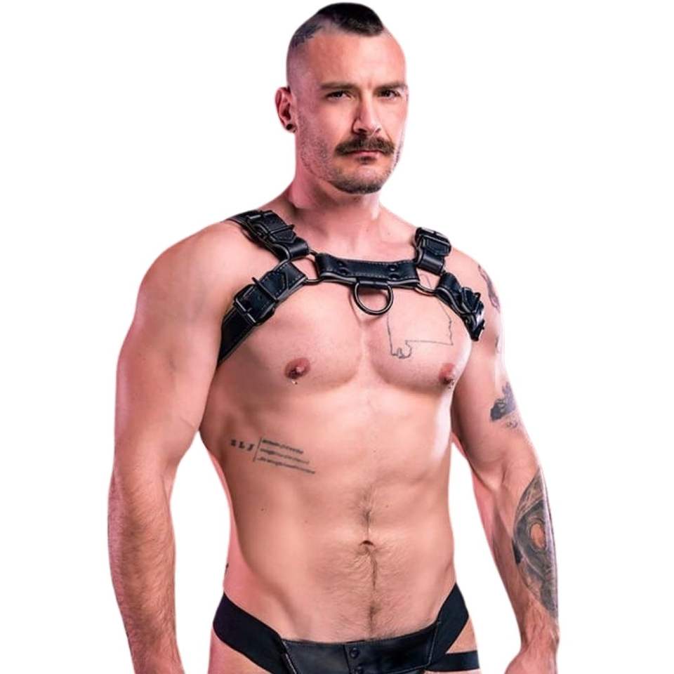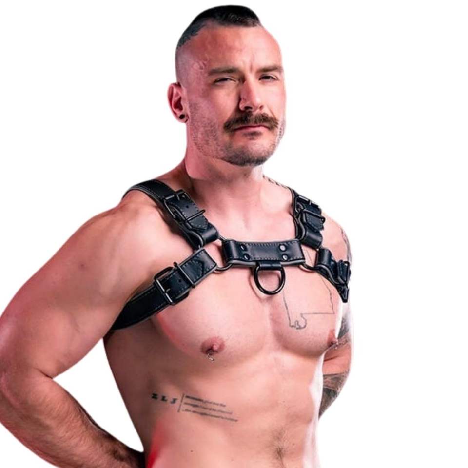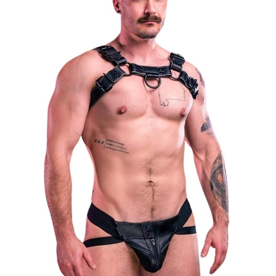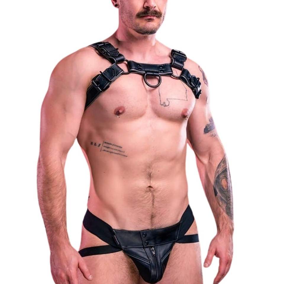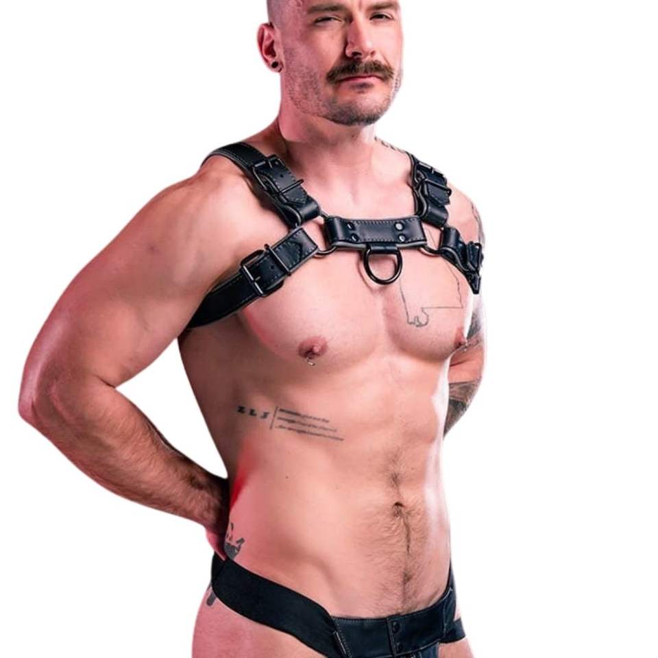 ชุดคอสตูมหนังเทียมทรงบูลด็อกสำหรับผู้ชาย สีเทา ปรับขนาดได้ กระชับหน้าอก พรีเมียม สไตล์คลับแวร์ เซ็กซี่ แต่งลูกไม้