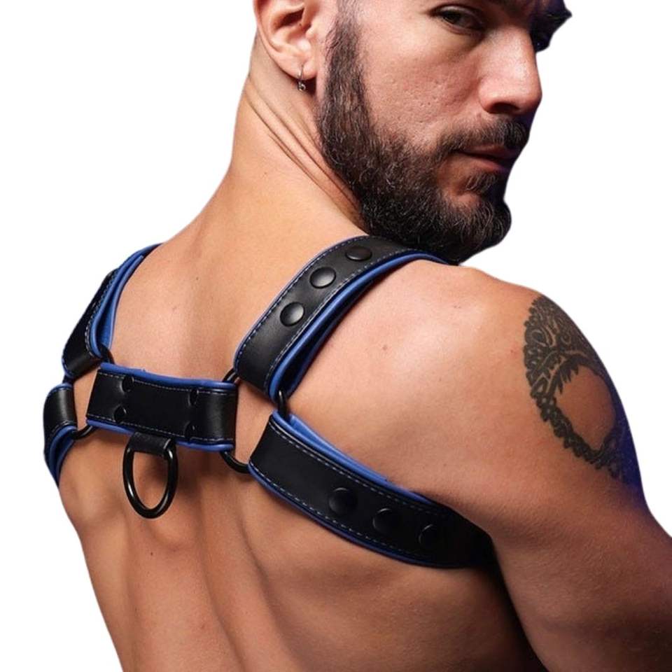 ชุดสายรัดหนังเทียมทรงบูลด็อกสำหรับผู้ชาย สีน้ำเงิน ปรับได้ กระชับหน้าอก พรีเมียม เหมาะสำหรับใส่ไปคลับ