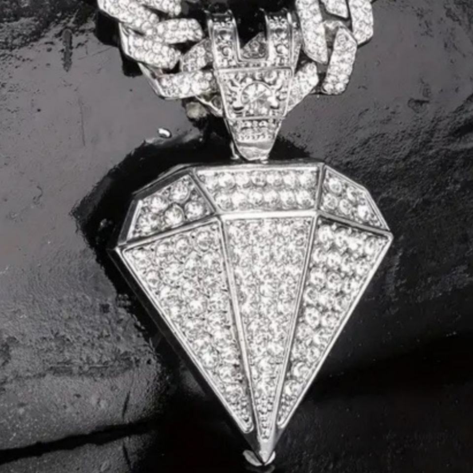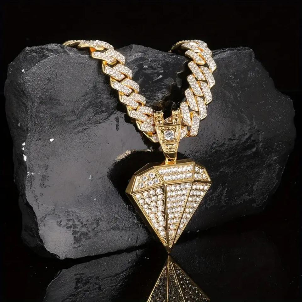 สร้อยคอจี้รูปทรงเพชรแบบฮิปฮอปสำหรับผู้ชาย ประดับเพชรเต็มเส้น โซ่คิวบันสีทอง เครื่องประดับสไตล์แร็ปเปอร์